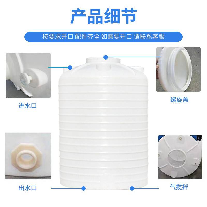 1. PE水箱所用塑料的软化点为108℃, 2. 碎裂点为-70℃,所以一般可用于盛装温度-40℃至60℃的液体 2、 PE塑料水箱罐体上的进料口、出料口、液位计口、法兰等均可按照客户要求位置大小安装。在盛装酸碱性物质时,要配置耐酸碱垫圈。在盛装有机物(特别是有机溶剂)时,配置不易溶解的橡胶垫圈 3、PE塑料储罐的材质为全新料食品级LLDPE。PE塑料储罐可以盛装常温下的、碱、盐大部份物质及许多有机物。 4、PE旋塑(滚塑)工艺一次性模式成型,是大多数化工等液体理想的储存和运输设备,在相当大的范围内可取代不锈钢、镍、钛,铁等材料的储罐