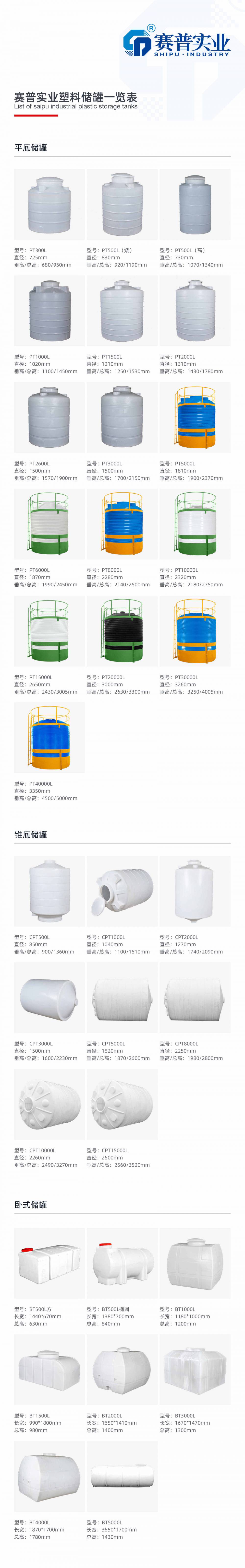 1. PE水箱所用塑料的软化点为108℃, 2. 碎裂点为-70℃,所以一般可用于盛装温度-40℃至60℃的液体 2、 PE塑料水箱罐体上的进料口、出料口、液位计口、法兰等均可按照客户要求位置大小安装。在盛装酸碱性物质时,要配置耐酸碱垫圈。在盛装有机物(特别是有机溶剂)时,配置不易溶解的橡胶垫圈 3、PE塑料储罐的材质为全新料食品级LLDPE。PE塑料储罐可以盛装常温下的、碱、盐大部份物质及许多有机物。 4、PE旋塑(滚塑)工艺一次性模式成型,是大多数化工等液体理想的储存和运输设备,在相当大的范围内可取代不锈钢、镍、钛,铁等材料的储罐。