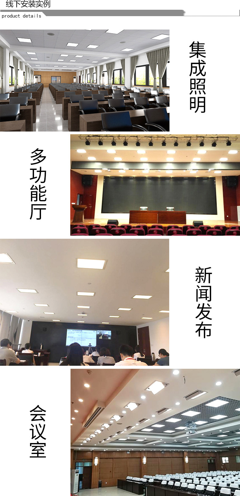 LED内嵌式会议室灯具是一款专为视频会议室设计的一款面光灯和轮廓光,角度可调,亮度可调,发光均匀,照度高,亮而不刺眼,显色指数高,拍摄画面清晰,代替了传统的三基色冷光灯,采用先进的设计和加工工艺,外表采用高强度铝型材定制而成,配合现代感的流行线外型设计,使其外观整齐亮丽。设有LED显示屏控制DMX编码及灯体功能选择,内置抗干扰电路,其结构完善紧密,内置电子调节灯泡亮度,可随时调节灯泡亮度。白色,正方形用于矿棉板吊顶,长方形用于石膏板吊顶,安装简单,效果美观;适用于视频会议室、电教室、拍课教室、学术报告厅、多功能厅、新闻发布会现场等需要拍摄的场合。