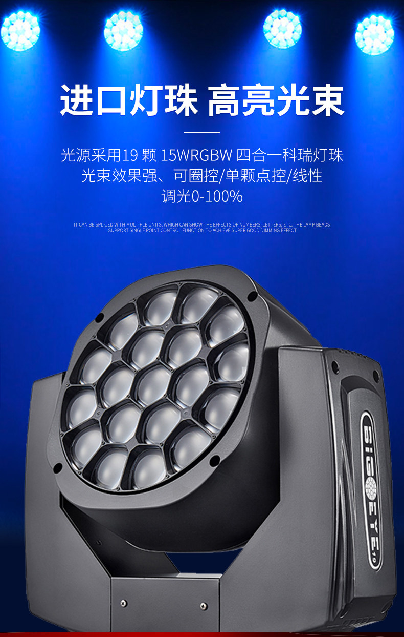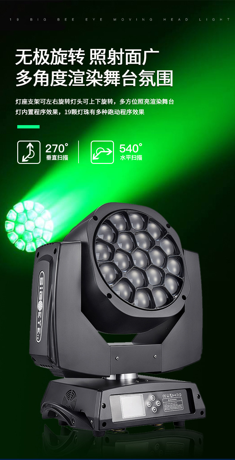 MHL1915是一款独特的前卫性的大功率LED摇头灯,具有3种不同的效果功能,均匀纯净的染色效果,凌厉的光束效果和炫目的视觉效果。产品使用19颗15W 4合1的LED灯珠,与19块专门设计的高效光学透镜配合,产品前面的透镜板可360°无极旋转,创造出多束花瓣状的凌厉的细小光束,灯具同时具备了每颗灯珠每种颜色单独可控的功能,这些细小的光束通过控制可开可合,营造出瞩目的动态灯光效果。同时具备变焦功能,变焦角度范围为4°到60°,变焦快速顺滑安静。当投光角度为4°时,产品可有凌厉光束效果;当投光角度为60°时,产品可有均匀的染色效果。可根据不同的需要选择不同的透光角度。MHL1915采用19颗欧司朗四合一灯珠,结合独特蜂巢设计的透镜可以无极旋转带来多种梦幻效果。显示屏可以旋转180°以适应不同安装角度, 扫描位置记忆功能,可自动复位, 带风扇散热和温度自动检测功能,当系统检测到温度过高时会自动停止工作以保护灯具。