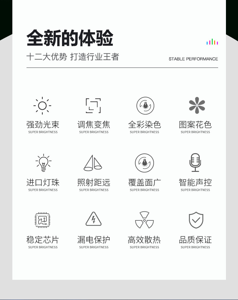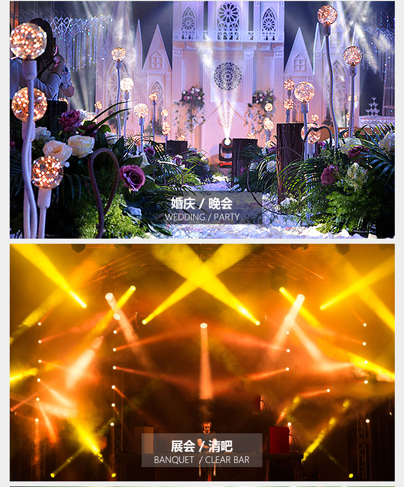 功能:前置镜头双向旋转,无缝拼接镜盘,非球面镜片结构,智能染色效果,光束边缘羽化效果,0-100%的线性调光,速度可调停止/频闪效果,带瞬间闭光、暗场功能,带调焦功能,前置透镜盘可双向旋转(速度可调节),单颗可点控,内置多种程序效果