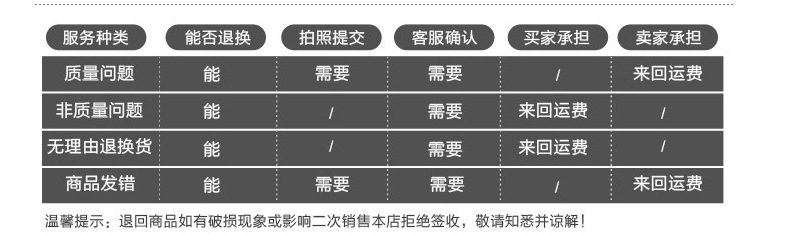 五、退换货政策:在不影响第二次销售的情况可退换货