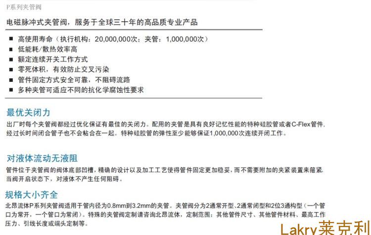 这种小巧的夹管阀(软管挤压阀、电磁压断阀)可以配合使用内径为1/32’’(0.79mm) 到 1/4’’(6.35mm)的管子。 管子内径大小可根据顾客要求在此范围内定做。 管子的替换可以轻易将其从阀上取下而不需要把夹管阀(软管挤压阀、电磁压断阀)从系统取下。提供2通常开或常闭型,双路2通常开型,以及3通和双路3通多功能结构夹管阀(软管挤压阀、电磁压断阀) ,为流路设计提供了更多样化的选择。3通夹管阀(软管挤压阀、电磁压断阀)提供多样流体控制包括2进样或者2出样口。标准阀带有30cm管道,可以选择硅胶管或者Beion Fluid管子或者顾客要求的管子。
