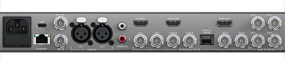 Teranex AV配备12G-SDI和HDMI 2.0a输入、环通以及输出接口,并设有用于同步信号的BNC接口。此外,它还设有2通道消费级HiFi以及XLR接口,以及4通道AES/EBU或2通道平衡模拟音频接口。如果演讲者佩戴领夹式麦克风或需要用到笔记本电脑的音频,那么Teranex AV就是他们的理想选择,因为它可以将音频可加嵌到任何输出视频上!除此之外,Teranex AV还设有一个光纤扩展槽,用户可自行添加光纤模块来实现视音频的超长距离传输!如果您只需使用SDI,则可选购搭载众多12G-SDI接口的Teranex Express型号!