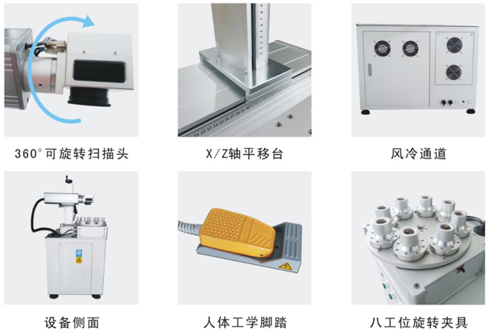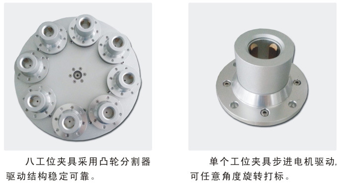 八工位激光打标机采用自动多工位旋转激光打标机采用独特的机构设计,光具座X/Z轴可手动移动方便客户调节,旋转轴采用多工位独立旋转标刻设计,减少上下料时间,提高工作效率。基于成熟稳定的光纤激光打标机升级而来,可实现平面打标和旋转打标,广泛应用于如灯座,气门,法兰盘,轴承等产品表面标记