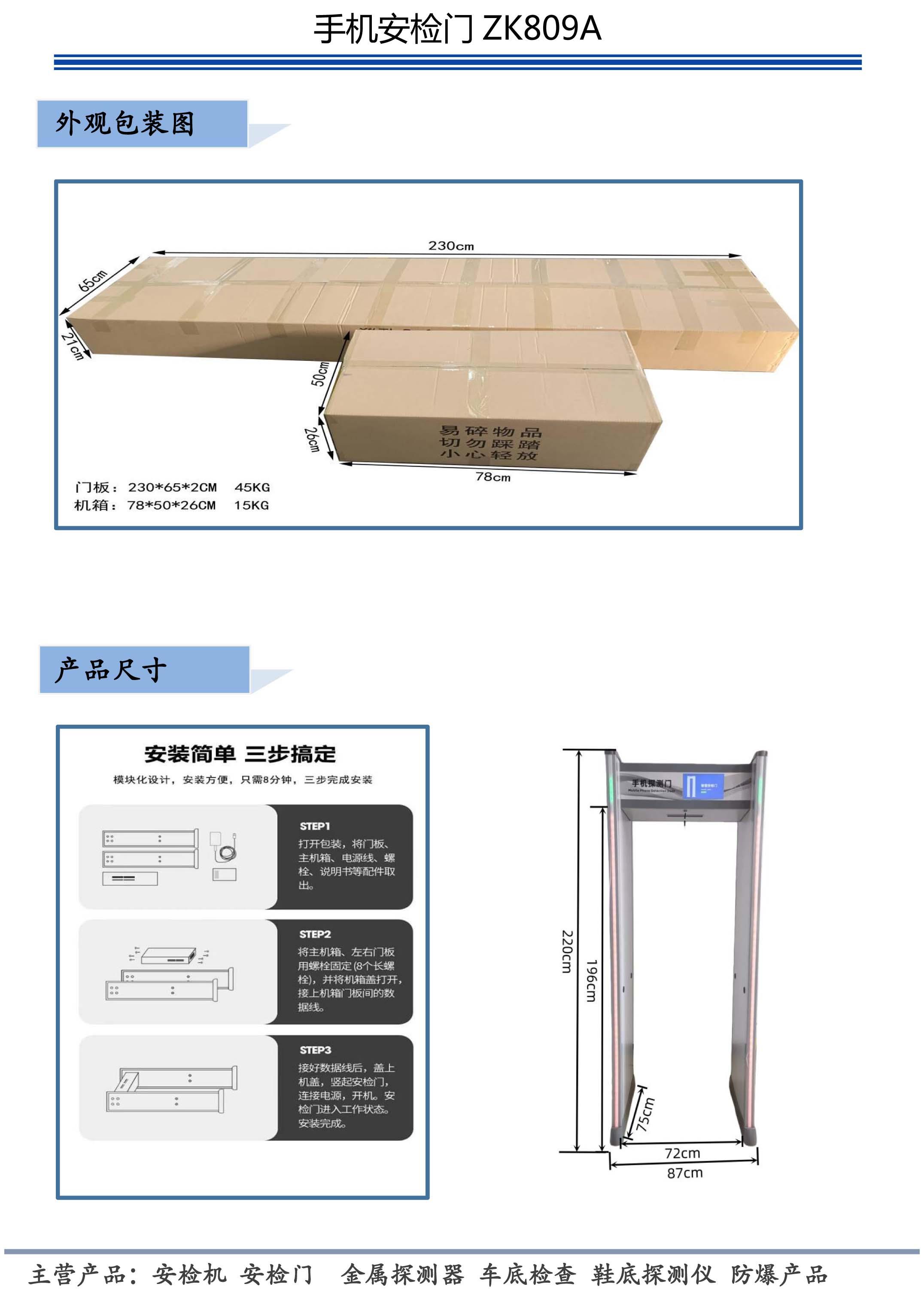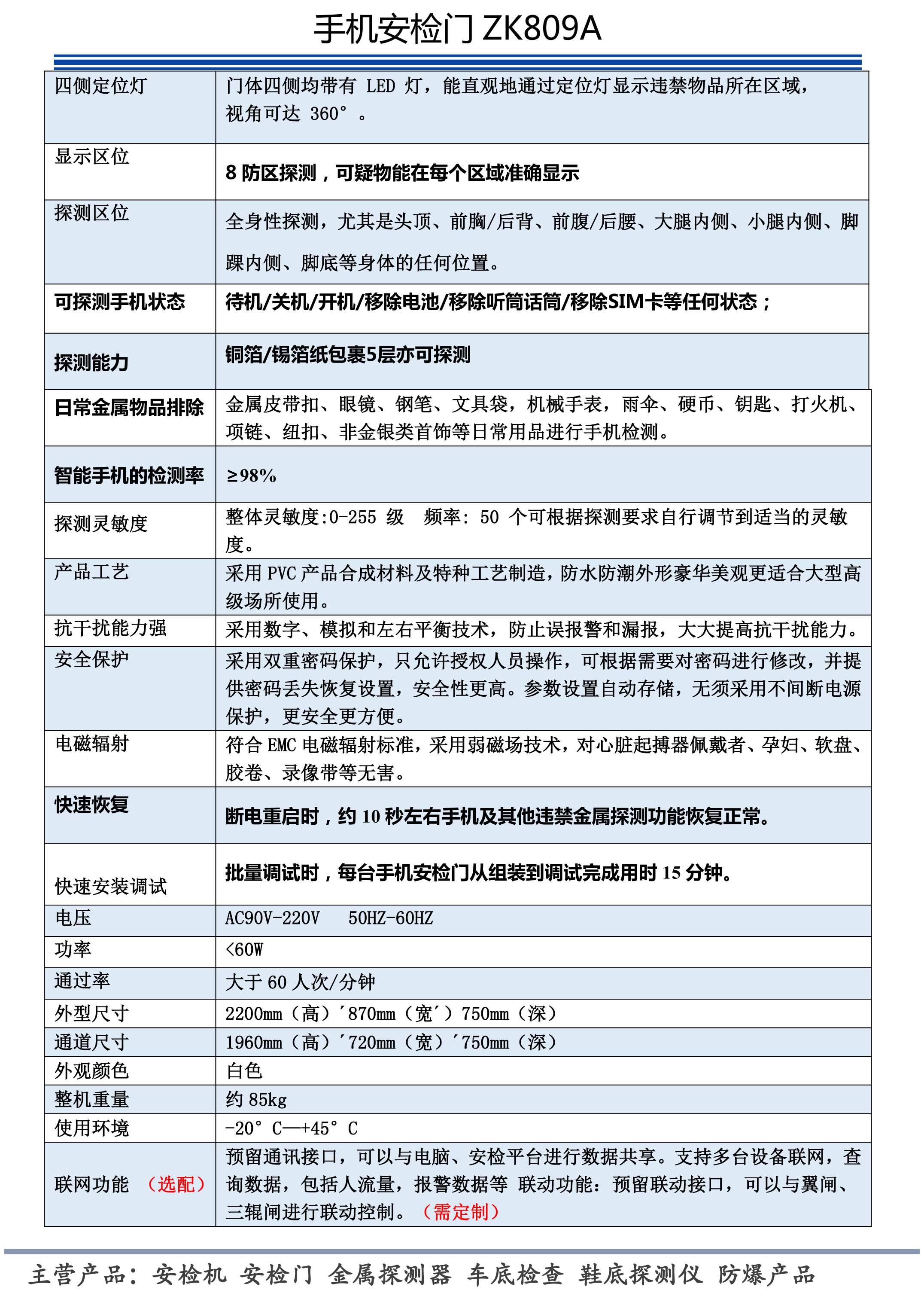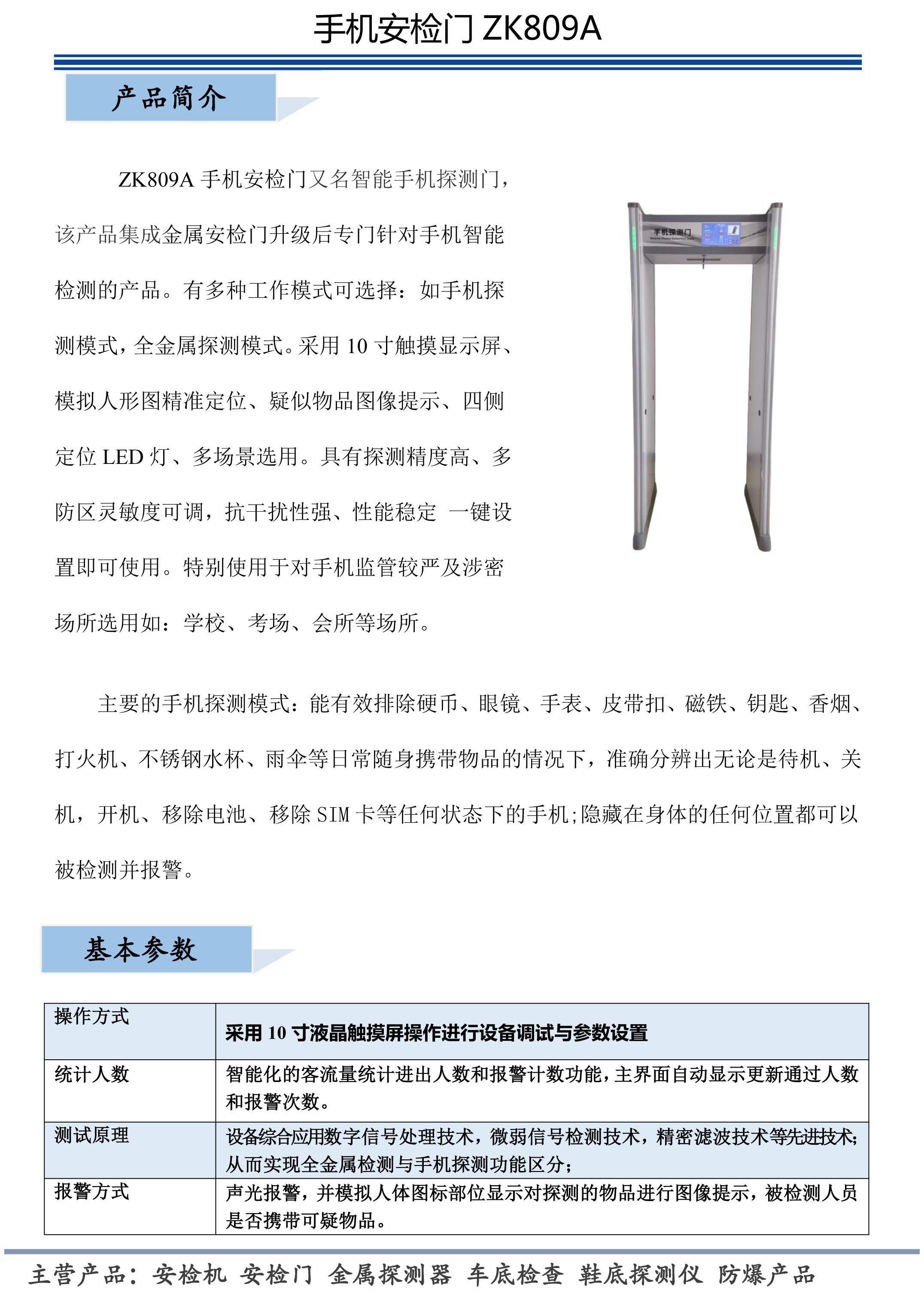 ZK809A手机安检门又名智能手机探测门,该产品集成金属安检门升级后专门针对手机智能检测的产品。有多种工作模式可选择:如手机探测模式,全金属探测模式。采用10寸触摸显示屏、模拟人形图定位、疑似物品图像提示、四侧定位LED灯、多场景选用。具有探测精度高、多防区灵敏度可调,抗干扰性强、性能稳定 一键设置即可使用。特别使用于对手机监管较严及涉密场所选用如:学校考场、会场、单位及保密场所。