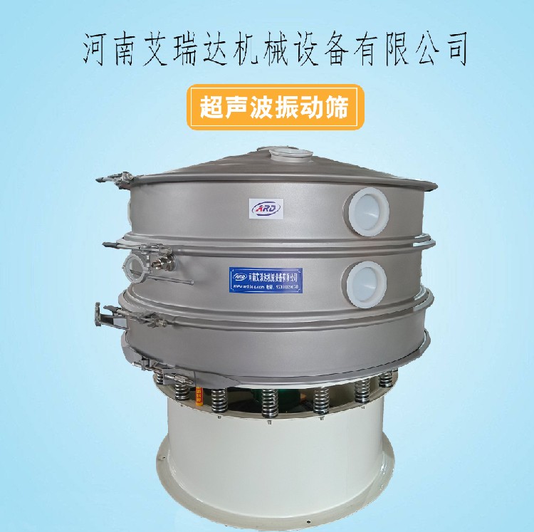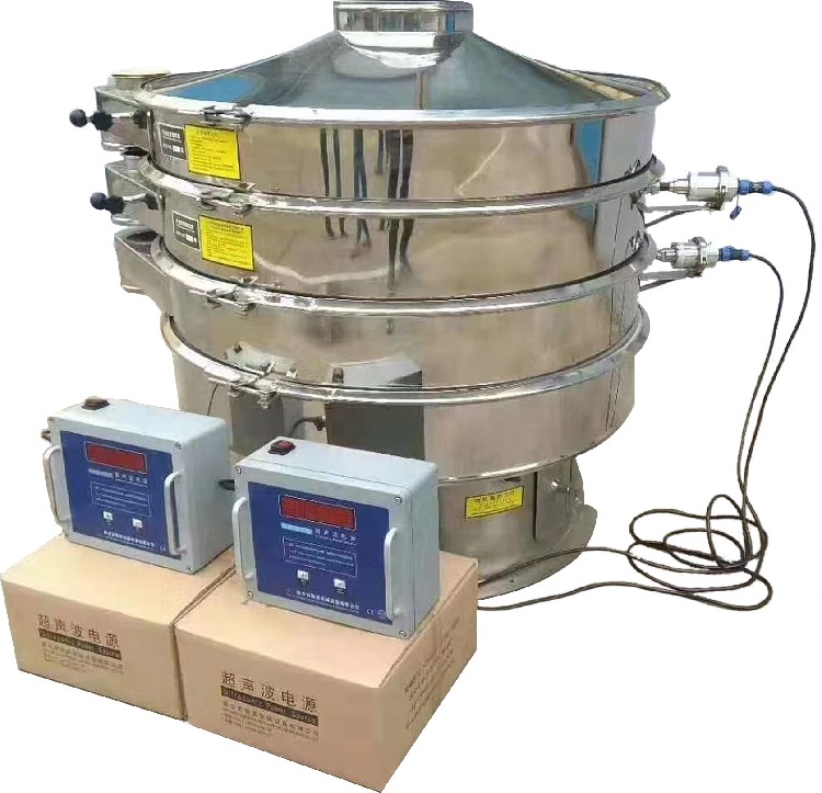 筛网上的物料在作低频旋振运动的同时,叠加上超声振动,既可防止网孔堵塞,又可使筛分机提高产量和质量,从而达到快速筛分和清网的目的,使超微细粉筛分成为易事。