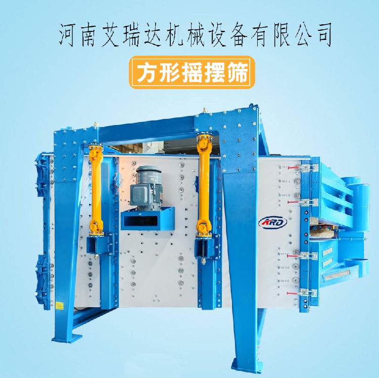 方形摇摆筛又称往复筛,具有高精度大产量的高效筛分设备;传动方式为仿人工式,运动轨迹为向前向左右画椭圆形轨迹,使物料贴近网面,在筛网上面采用椭圆曲线运动,驱动装置所产生的振动力是一绕定轴、方向呈一定规律变化的惯性力,其本质是由偏心轮绕定轴转动所形成的往复惯性力。