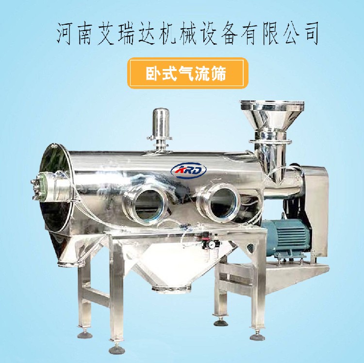 卧式气流筛又叫卧式气流筛分机,其有形状为横卧状,是一种专门针对微细粉进行高精度筛分的设备,可对细度范围在80-500目内的粉状物料很好的连续筛分,筛网可任意更换,主要要不锈钢及碳钢两种材质。
