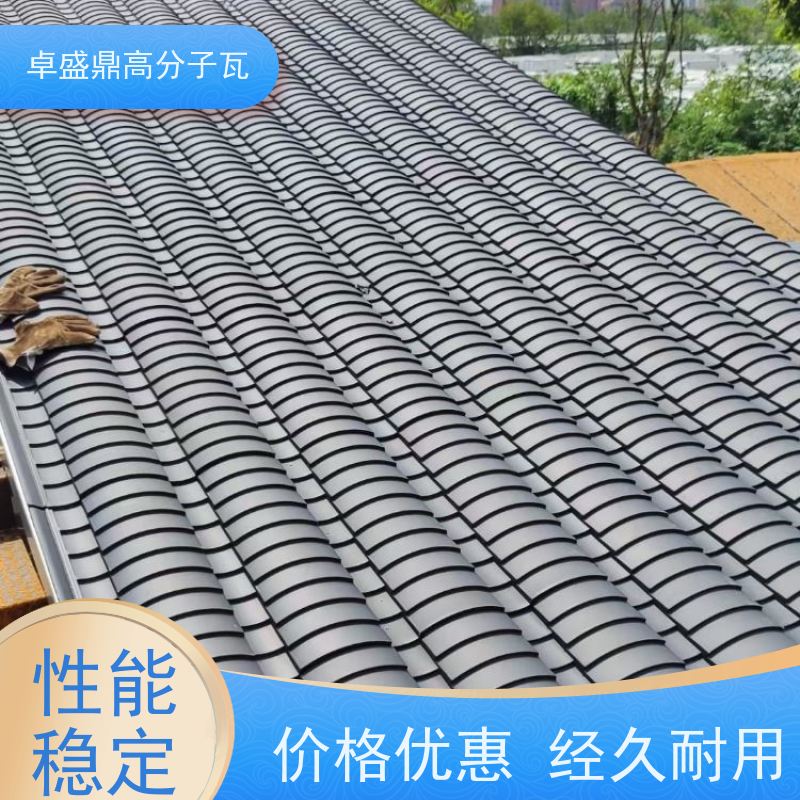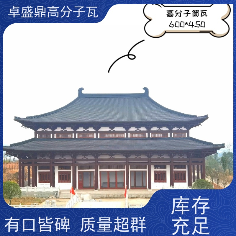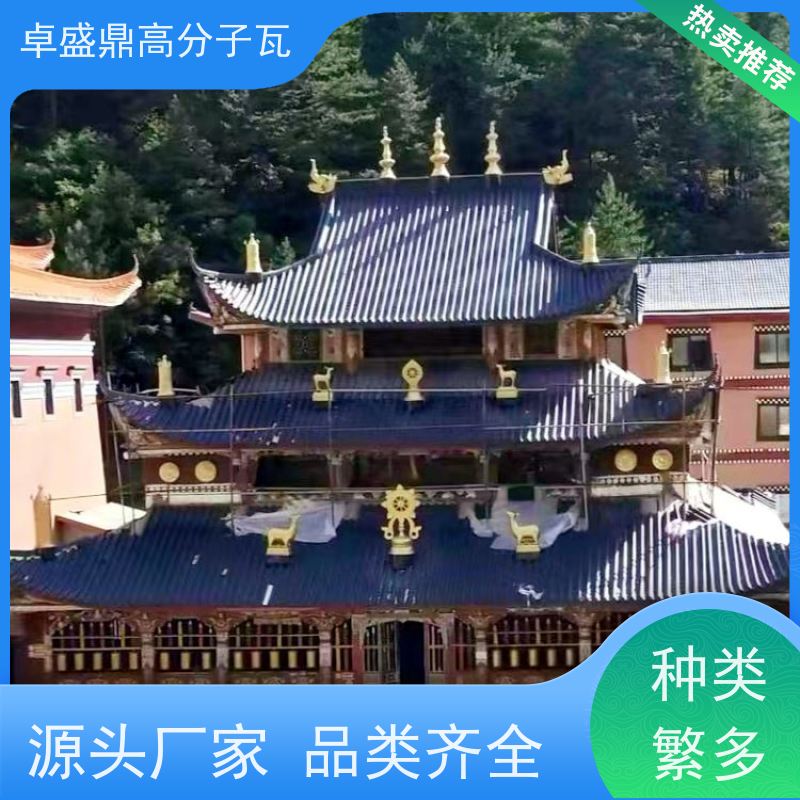 卓盛鼎古建寺庙高分子仿古瓦巧妙地将传统建筑美学与现代高分子材料工艺相结合。从外观上看,它完美复刻了传统古瓦的造型和纹理,无论是古朴典雅的小青瓦风格,还是气势恢宏的琉璃瓦样式,都能精准还原,让每一座古建寺庙都能散发出浓郁的历史韵味。其色彩丰富且持久,经过特殊的工艺处理,瓦片的颜色鲜艳饱满,能够经受住岁月的洗礼和自然环境的考验,长时间保持如新的状态,为古建寺庙增添了独特的魅力。