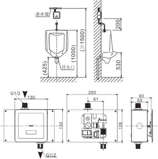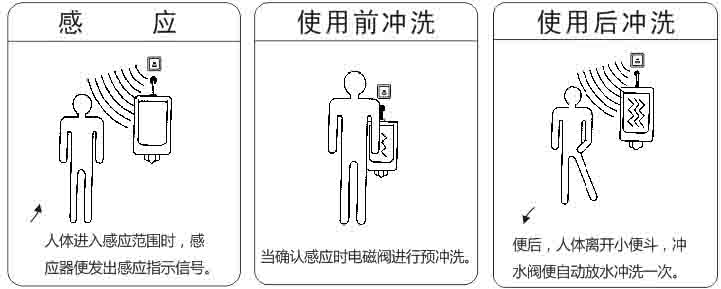 技术指标参数: ① 供电电源:a.c 220V/DC6.0V ② 静态功耗:≤0.5mW(D.C )/≤0.6W(~) ③ 适用温度:1 — 55℃ ④ 感应范围:60cm±15%(对29.7cm×29.7cm) ⑤ 进出水管径:(DN15)G1/2″ ⑥ 适用水压:0.05MPa - 0.6MPa (每台瞬间水流量为0.25L/s) ⑦ 面板尺寸:130x130mm; 预埋盒尺寸:200x128x65mm ⑧ 执行标准:CJ/T 194-2004 功能与特点: 自动冲水:通过感应部件,当人使用小便斗时自动对其进行冲洗。 防臭冲洗:当小便斗长期不使用时,冲水阀每隔12小时自动放水冲洗一次,防止存水弯中存水干枯,导致臭气回窜。 清洁卫生:便后手不需接触金属物件,一切冲水由感应器自动完成、无须人为操作,冲洗彻底、不留异味,并有效消除细菌 交叉感染。 节 水:根据小便斗使用的频率设置好冲水时间,节水功能显著。 维护方便:内设水量调节阀及过滤网,非专业人员即可轻松调节水量和清洗过滤网。 智 能:机器控制线路超微型设计,采用微电脑控制,无须人为调试。 电源可选:具有交流220V和电池两种供电方式可选择。 省 电:本产品使用4节5号碱性电池供电,按每天使用300次计算,两年内无须更换电池。 防刮感应窗:感应窗采用坚硬的玻璃设计,起到防止感应窗刮伤、烟头烧烫等保护作用。 使用说明: