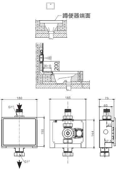 技术指标参数: ① 供电电源:a.c 220V/DC6.0V ② 静态功耗:≤0.5mW(D.C )/≤0.6W(~) ③ 适用温度:1 — 55℃ ④ 感应范围:67cm±15%(对29.7cm×29.7cm) ⑤ 进出水管径:(DN25)G1″ 出水口管径: de32 ⑥ 适用水压:0.1MPa - 0.6MPa (每台瞬间水流量为1.2L/s) ⑦ 面板尺寸:180x150mm; 预埋盒尺寸:185x144x65mm ⑧ 执行标准:CJ/T 194-2004 功能与特点: 节水、卫生:一切冲洗动作由机器自动完成,无须人为操作,冲洗彻底,不留异味,并有效避免细菌交叉感染。 省 电:直流产品使用4节5号碱性电池时,若按每天使用300次计算,2年内无须更换电池。 电源可选:具有d.c6V电池和~220V电源供电方式可选择。 维护方便:内设水路过滤装置, 产品工作稳定可靠,维护方便。 智能防臭:当便器长期处于不使用状态,冲水阀将每隔24小时冲洗一次,以防存水弯中存水干涸,导致臭气回窜。 安装特性:产品超薄设计,可安装于6分薄墙体中。 防刮感应窗:感应窗采用坚硬的玻璃设计,防止被刮伤、烟头烧烫。 面板特性:面板采用全不锈钢材料一次性冲压成形,常洗常新,防锈性能绝佳,且具耐刮耐踢防破坏等优点。 使用说明: