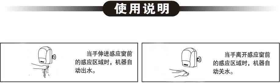 技术指标参数: ① 供电电源:d.c 6V(直流6V电池) ② 静态功耗:< 0.5mW(d.c) ③ 感应范围:50cm(±15%)(对29.7cm×29.7cm标准板) ④ 进出水管径:(DN15)G1/2″ ⑤ 适用水压:0.1MPa - 0.6MPa ⑥ 使用环境温度:1℃-55℃,湿度:<95% ⑦ 执行标准:IP56 功能与特点: 自动调节感应距离:通电后,感应头进入自动调节距离状态,指示灯连续闪烁8次,累计持续10秒(注意:在该状态下,不得有物体在感应窗前晃动) 节水、卫生:一切冲水动作由机器自动完成,无需人为操作,有效消除细菌交叉感染。 超时保护:当连续使用超过60秒钟,水龙头自动关水,连续不感应10秒后恢复正常。该功能设置有效避免因误动作而造成水资源的浪费。 维护方便:设有易拆卸过滤网,非专业人员即可轻松维护。 省电:使用4节5号碱性电池时,每天使用300次,2年内无须更换电池。 电源可选:产品可根据不同需求,选择交、直流两种供电方式。 电池更换提示:当电池电量不足时,机器将自动提示更换电池。