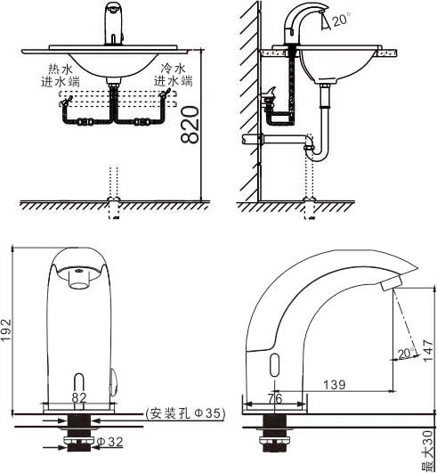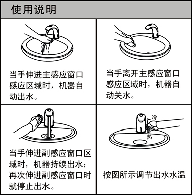技术指标参数: ① 供电电源:d.c 6V(直流6V电池) ② 静态功耗:< 0.5mW(d.c) ③ 感应范围:主感应:36cm(±15%) 副感应:10cm(±15%)(对29.7cm×29.7cm标准板) ④ 进出水管径:(DN15)G1/2″ ⑤ 适用水压:0.05MPa - 0.6MPa ⑥ 感应确认时间:3s ⑦ 热水温度:50℃-85℃ ⑧ 冷水温度:5℃-29℃ ⑨ 使用环境温度:0℃-55℃ ⑩ 外观尺寸:203×74×192mm ⑾ 执行标准:CJ/T 194-2004 功能与特点: 907 感应龙头,采用红外线感应原理设计制造而成,具有双感应窗,更适合家庭使用。 主感应窗:即感应即出水,不感应不出水,连续感应1分钟自动停止出水; 副感应窗:感应一次出水,再感应一次停止出水,连续出水1.5分钟后自动停止出水。 ①.节水、卫生:一切冲水动作由机器自动完成,无需人为操作,有效消除细菌交叉感染。 ②.超时保护:当主感应窗感应超过1分钟, 即停止供水; 同样感应一次副感应窗, 连续出水1.5分钟后自动停止出水。离开感应范围10秒后,机器恢复正常使用。该功能的设置有效避免因误动作造成水资源的浪费。 ③.内设止回阀:在冷热水管道均设有止回阀, 防止冷热水互窜。 ④.维护方便: 设有易拆卸过滤网, 非专业人员即可轻松维护。 ⑤.智 能: 机器控制线路超微型设计,采用微电脑控制,出厂时已设定好感应范围,无须人为调试。 ⑥.省 电: 本产品使用4节5号1.5V碱性电池供电,若按每天使用300次计算,两年内无须更换电池。 ⑦.调温功能:手动调节适合的出水水温。 ⑧.安装方便:一体化设计,无需安装控制盒、布线等工作。