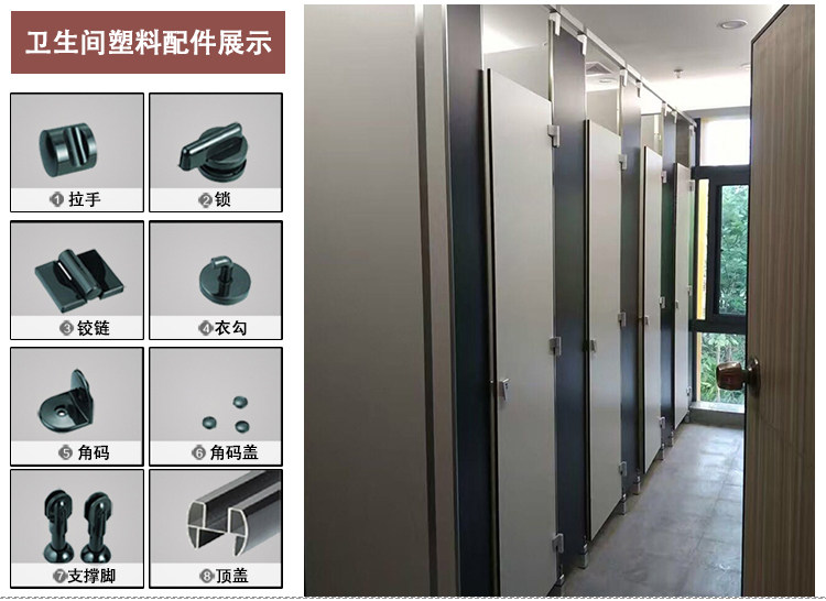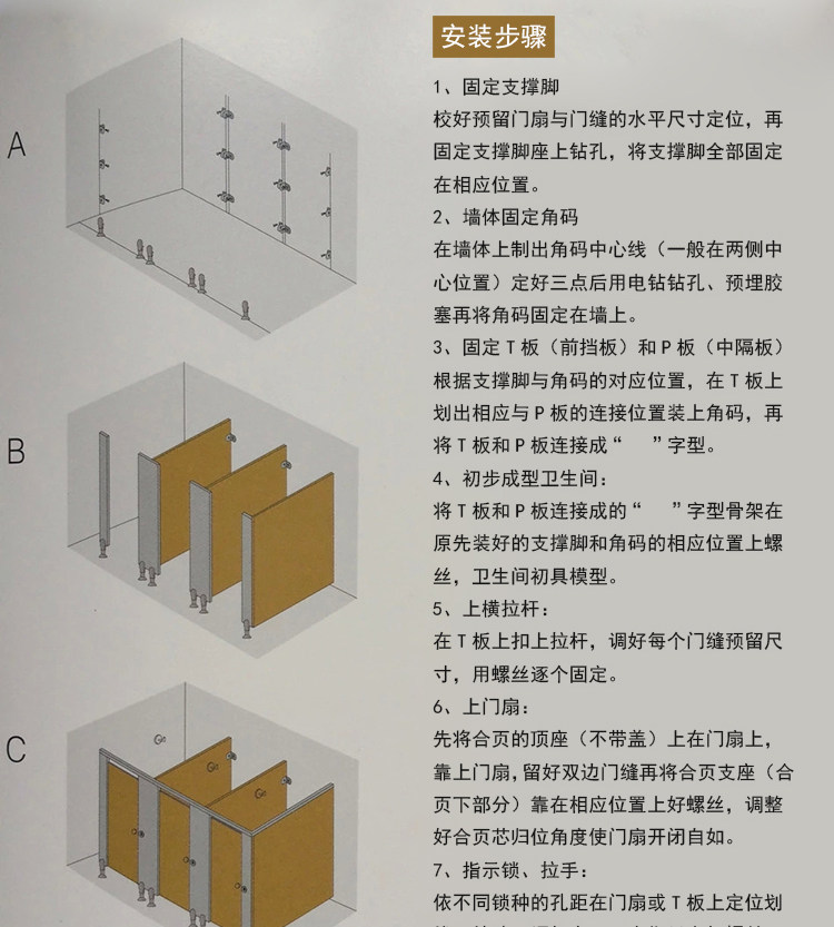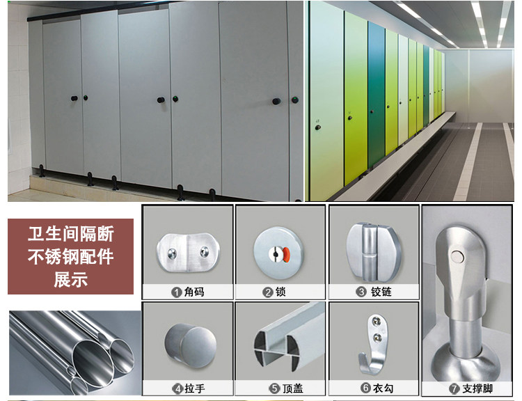不锈钢件与地面连接固定,立柱与墙和隔板用同质同色