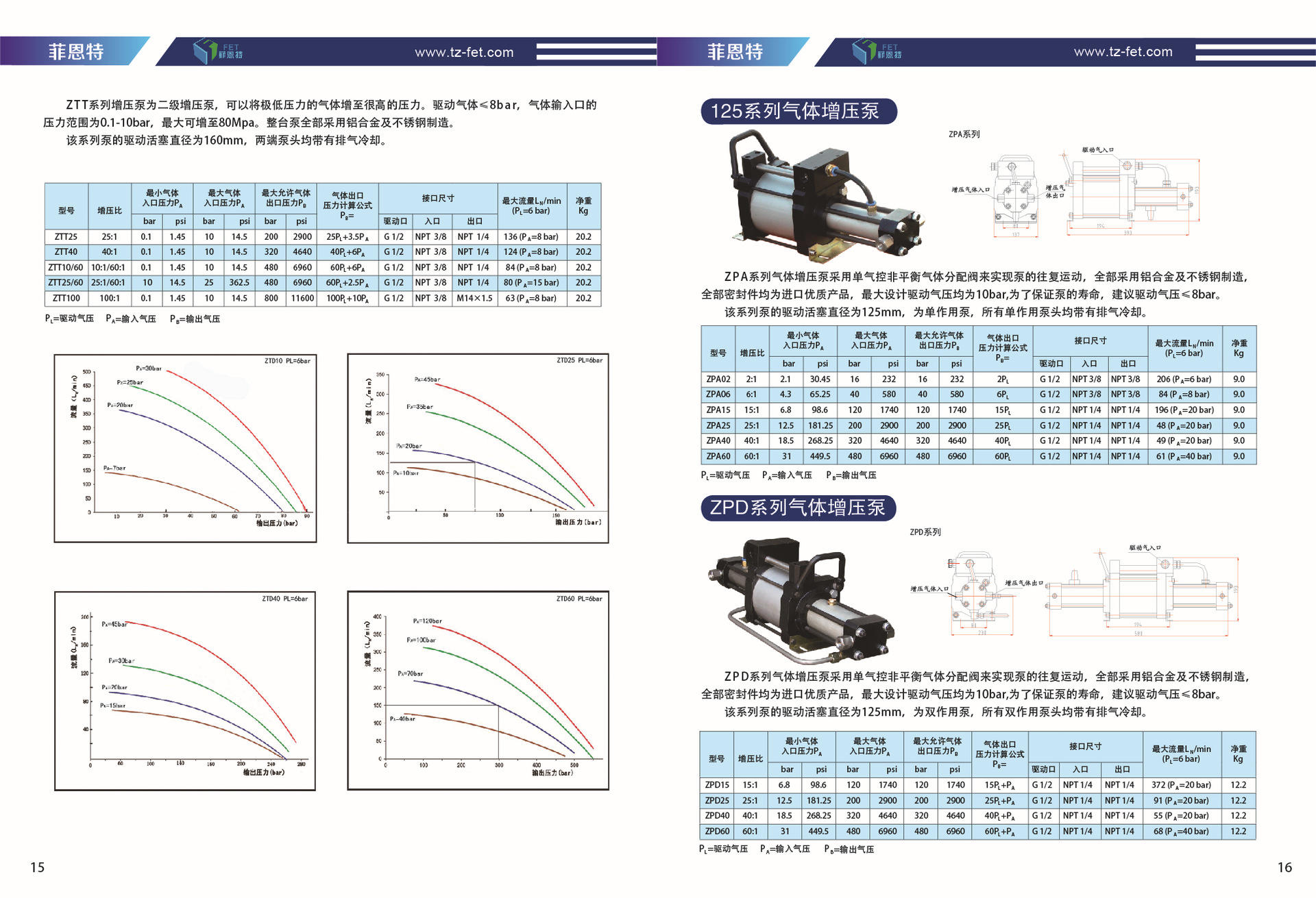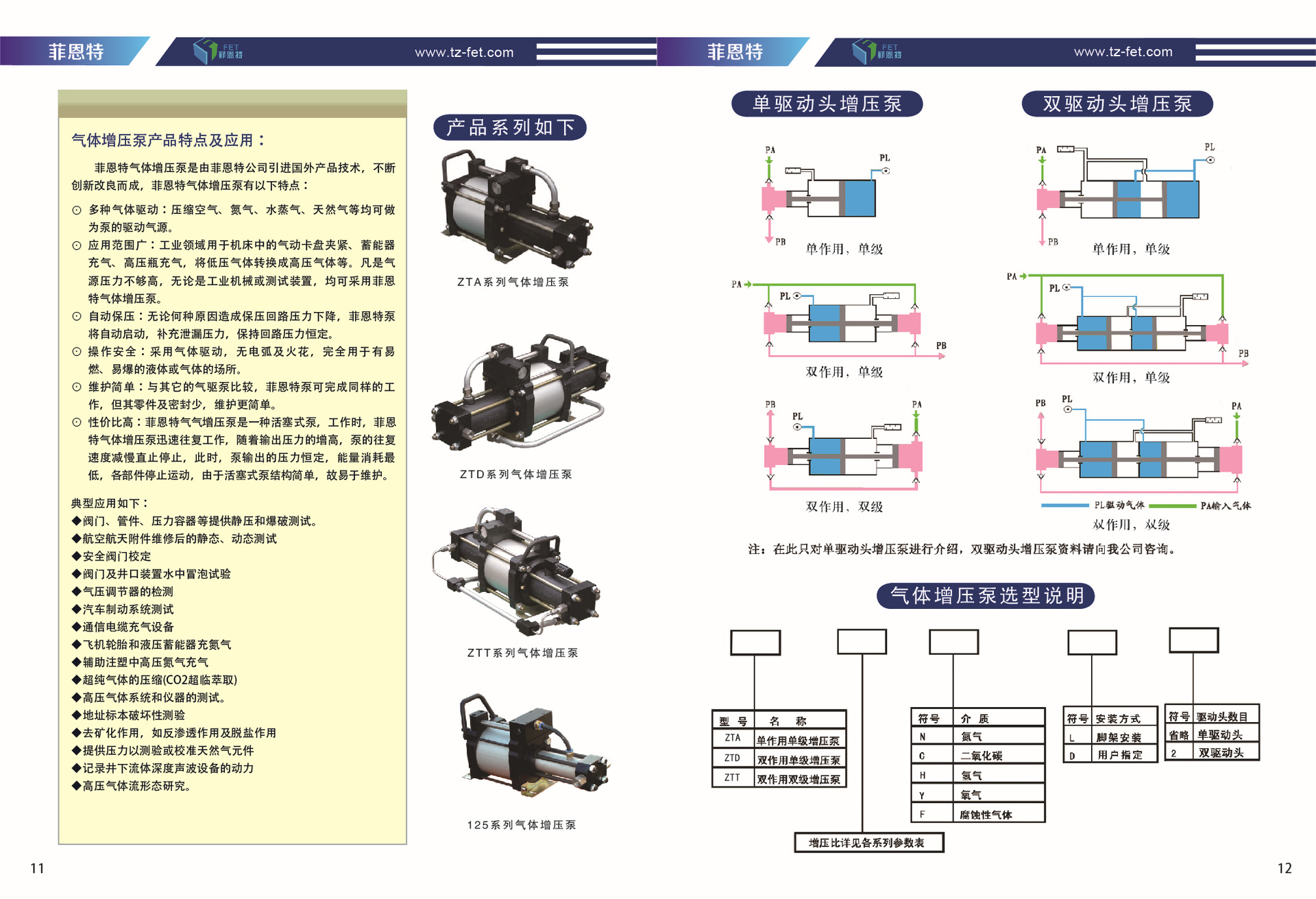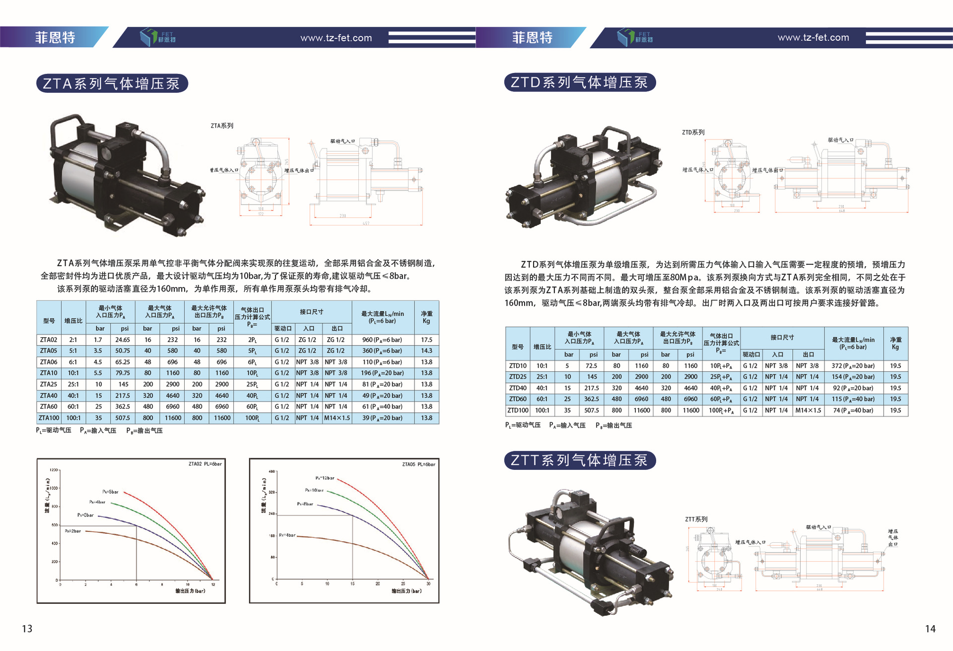 ZTA系列气体增压泵采用单气控非平衡气体分配阀来实现泵的往复运动,全部采用铝合金及不锈钢制造,全部密封件均为进口产品,大设计驱动气压均为10bar,为了保证泵的寿命,建议驱动气压≤8bar。