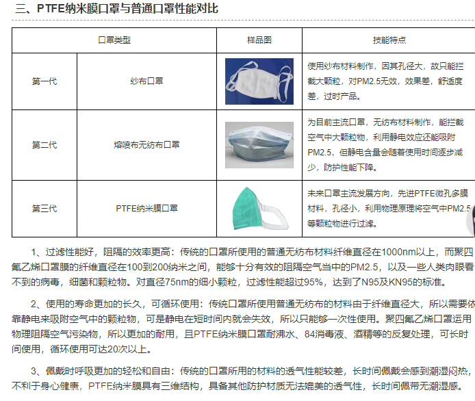 PTFE纳米膜,新型口罩专用材料,对病毒的隔绝率达到99.5%以上,口罩抗老化防辐射,可反复使用。国务院2020年2月21日,亲自作出批示,要大力发展可重复使用的环保型纳米口罩
