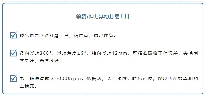而领航机器人的浮动去毛刺产品在这样的背景下脱颖而出。它独特的 360°径向浮动特性,使其能够完美适应多曲面零部件的复杂形状,进行全方位、无死角的去毛刺处理。这种自适应加工的能力,大大提高了去毛刺的效率和效果,确保零部件的表面光滑平整。
