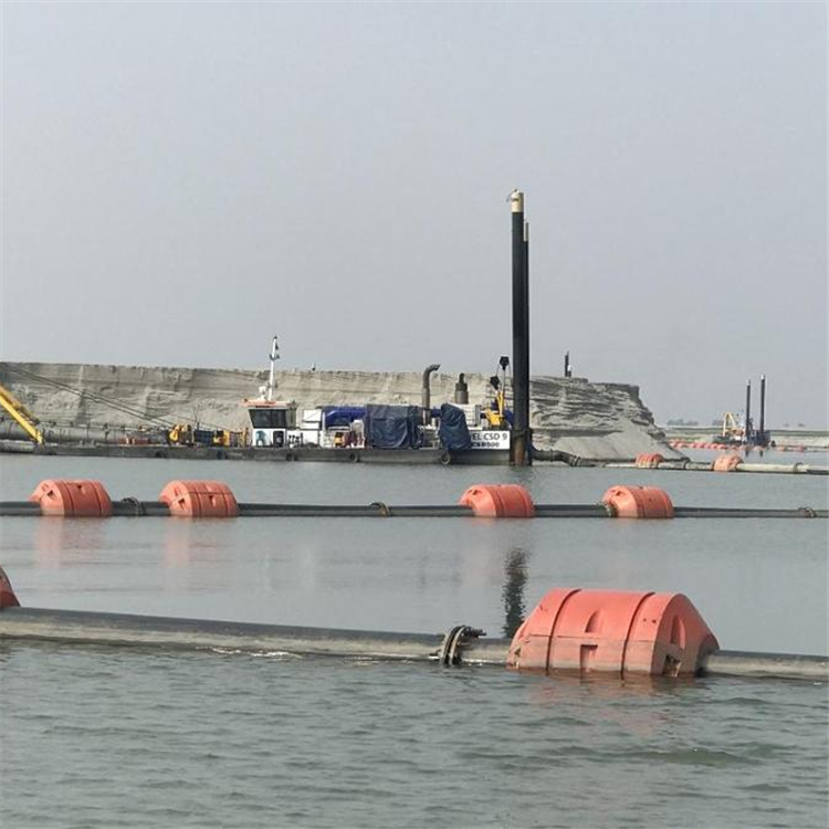 各种尺寸中密度聚浮体抽沙排泥浮筒包括一个或一个以上的浮体,所述浮体呈圆环状或圆弧状,所述浮体捆绑在管道的外侧,管道外侧相邻的浮体之间留有间隙,浮台的内部带有空腔,在空腔内填充有塑料泡沫;
