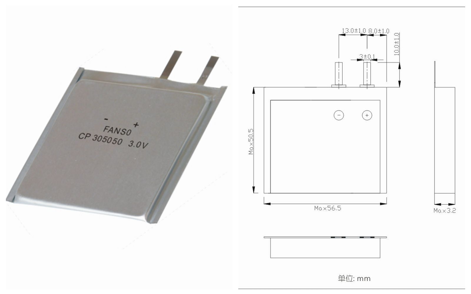 | CP305050 | 50.5×56.5×3.2 | 14 | 3.0 | 1600\5.0 | 600 | -20 ~ +60 | 1.8 | |