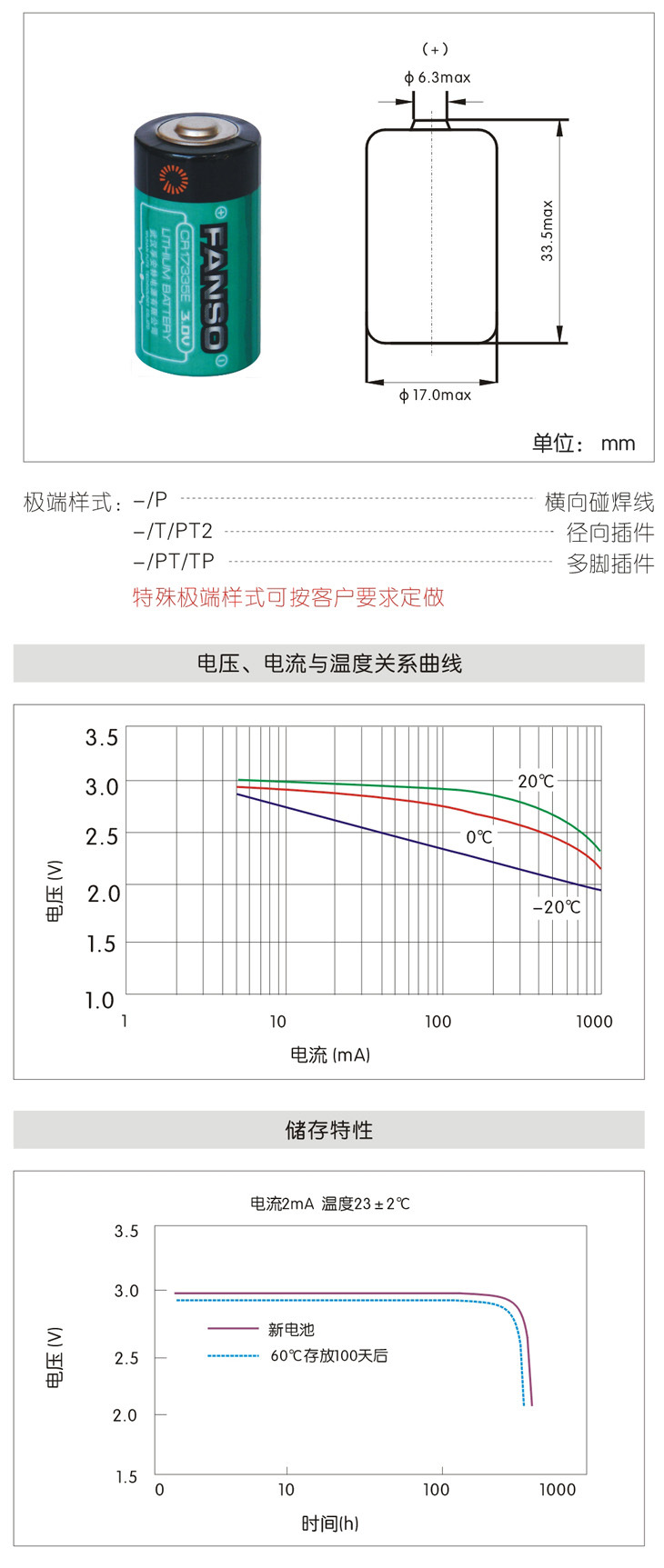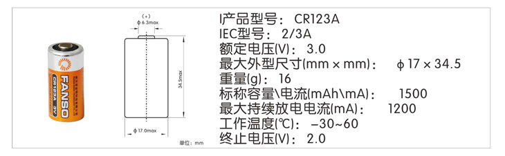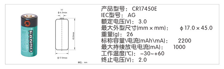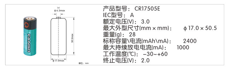 CR17335E功率型FANSO一次锂电池1350mAh 孚安特锂锰电池3.0V