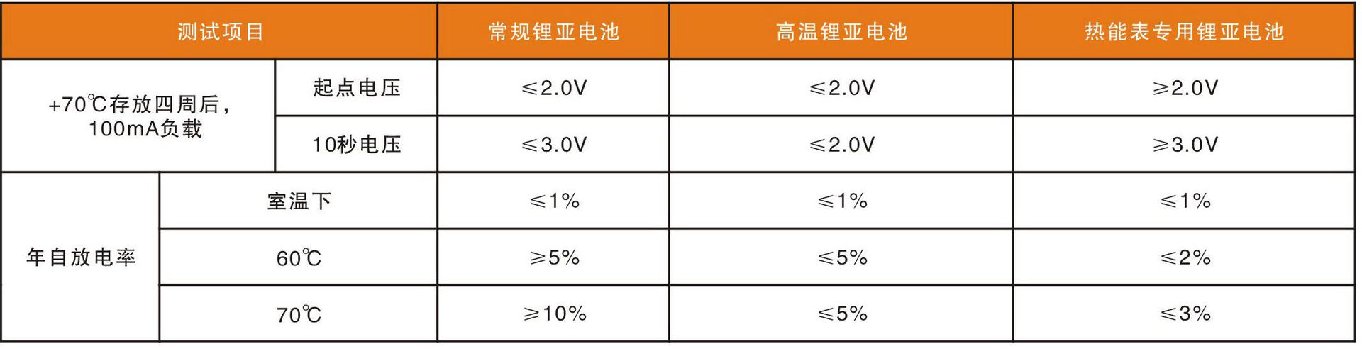 电池在50℃存放一年,热表专用电池的可放出新电池90%以上的容量,而常规电池只能放出新电池40%左右的容量。
