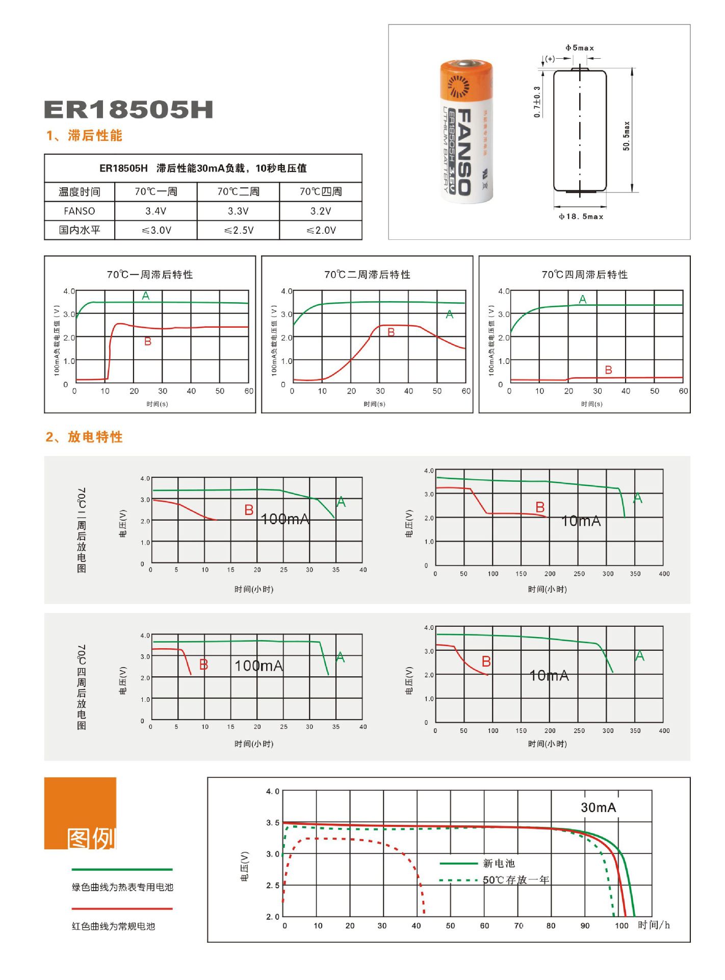 针对热能表的这些工作特性和特殊的工作环境,武汉孚安特科技有限公司为它量身定制了一种电池---热能表专用锂电池(主要型号ER26500H、ER18505H、ER17505H等)。这种电池是在锂亚硫酰氯常规电池盒高温电池的基础上开发出的一款新特性电池:与常规电池相比,在保持原来电池基本性能的基础上,它具有更好的耐高温性能(可承受+95℃的工作温度);与高温电池相比,它具有突出的低滞后性能(在+70℃存放三个月,可正常工作)和自放电小(年自放电率小于1%)的特性。解决了目前热能表寿命短的问题,体现了该电池具有良好的贮能性,电性能达到了国外先进水平。