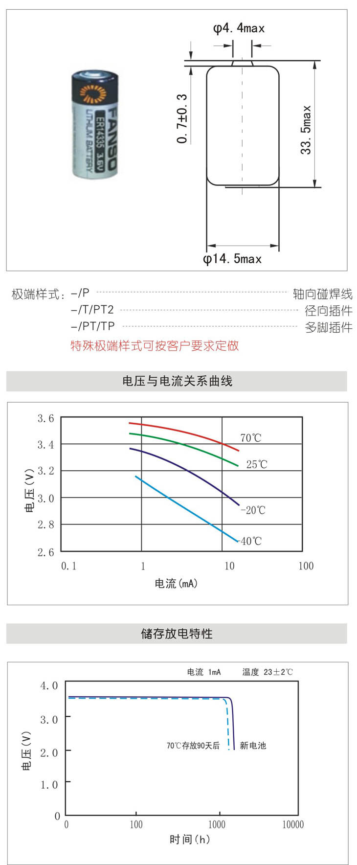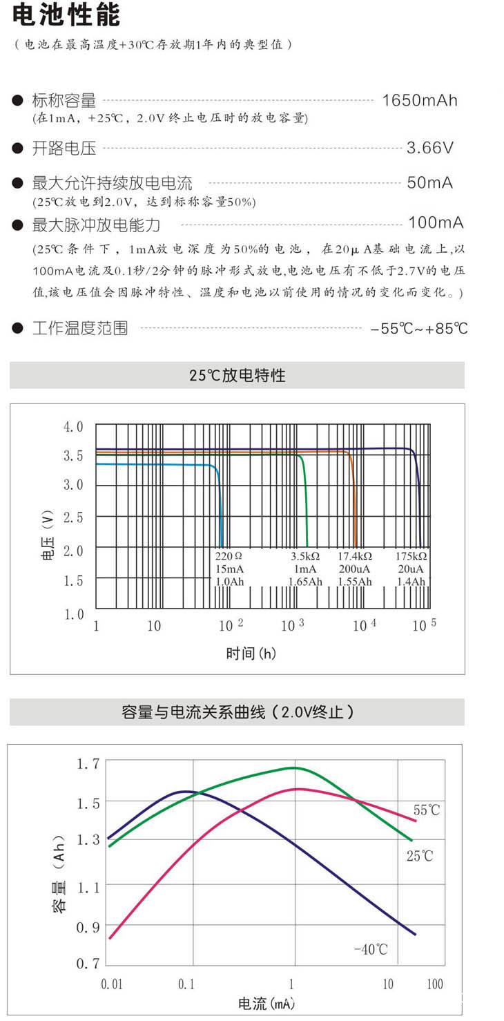 3.6V 锂亚硫酰氯电池(Li-SOCl2)主要特性