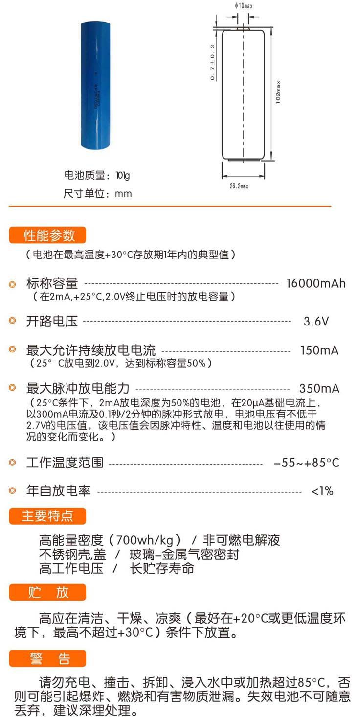 大容量CC型锂亚电池ER261020,武汉锂亚电池厂家,孚安特3.6V锂电池