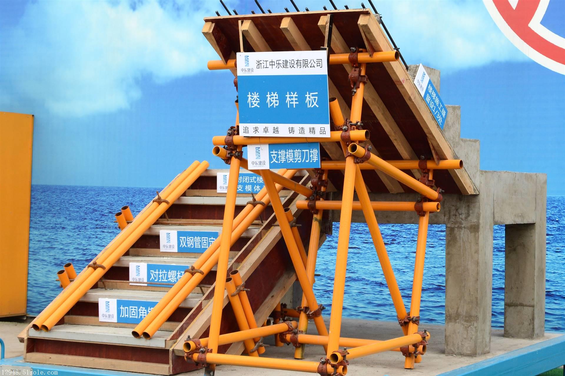 土建样板展示区-楼梯样板展示:钢筋混凝土、钢筋绑扎、封闭式支模体系、混凝土施工缝留设与混凝土浇筑,角钢加固,双钢管固定等工艺。