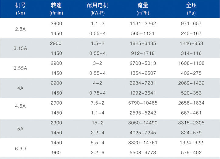 1、本风机制成单吸入,机号有:№2.8、3.15、3.55、4、4.5、5、6.3、8、10、12.5、16、20等十二个机号。