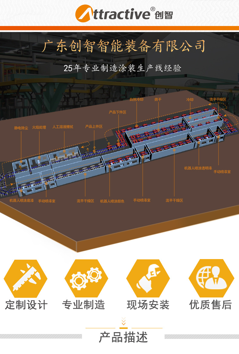 广东创智智能装备有限公司,是一家集研发、设计、制造、安装、调试、售后服务于一体的综合性企业,拥有25年涂装生产线整体解决方案经验,能为客户提供各类非标涂装生产线、涂装设备、环保设备等整体解决方案。