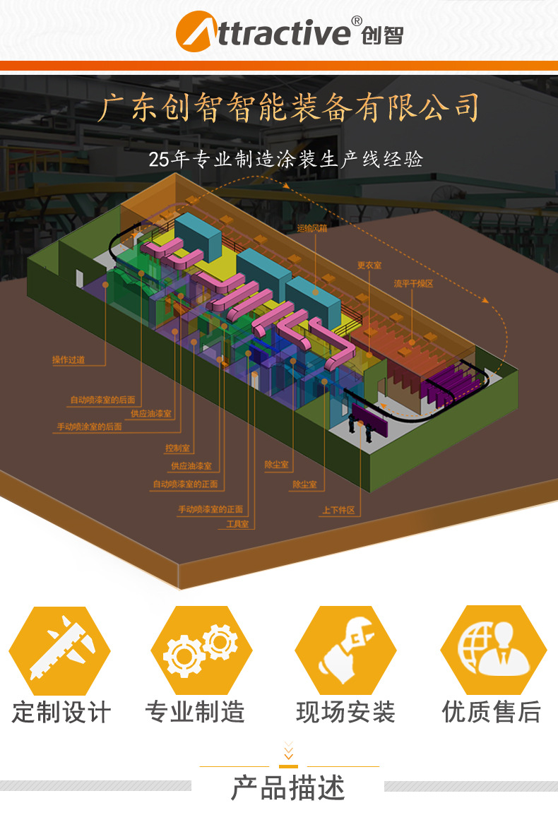 广东创智智能装备有限公司,是一家集研发、设计、制造、安装、调试、售后服务于一体的综合性企业,拥有25年涂装生产线整体解决方案经验,能为客户提供各类非标涂装生产线、涂装设备、环保设备等整体解决方案。