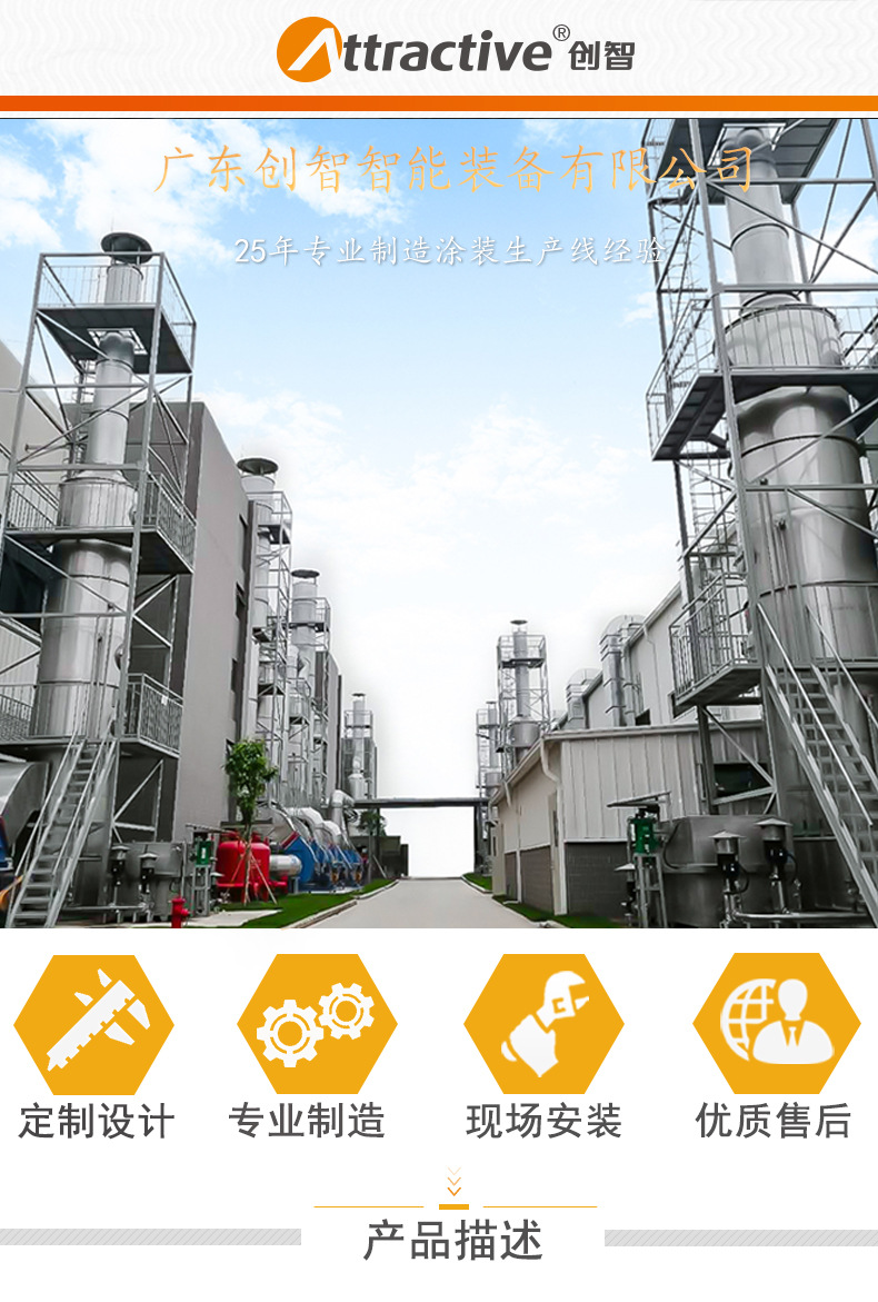 广东创智智能装备有限公司,是一家集研发、设计、制造、安装、调试、售后服务于一体的综合性企业,拥有25年涂装生产线整体解决方案经验,能为客户提供各类非标涂装生产线、涂装设备、环保设备等整体解决方案。