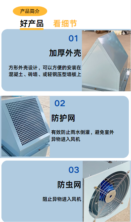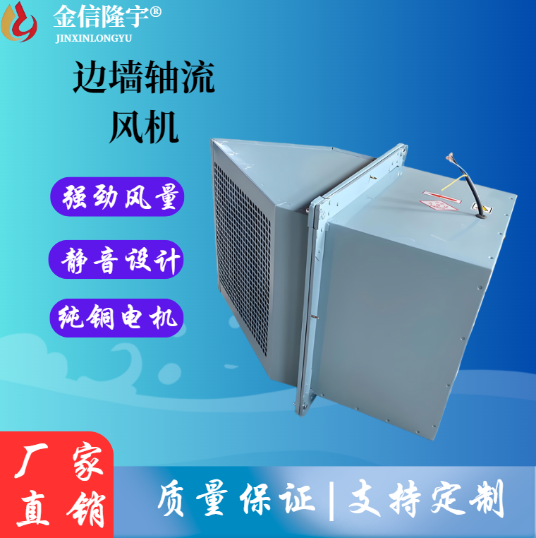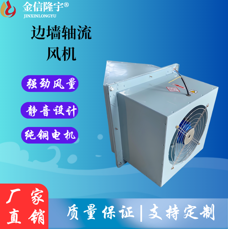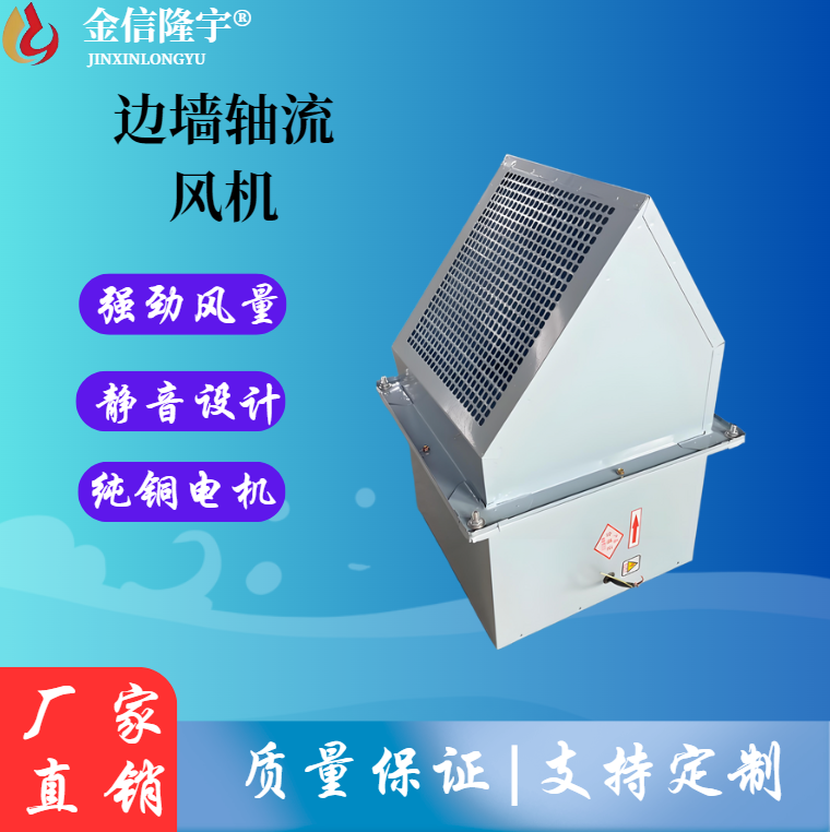 边墙风机采用先进的前掠型叶片、低噪音的外转子或内转子风机专用电机直联传动,方形外壳设计可以方便地安装在混凝土墙、砖墙或轻钢压型墙板上,方形防雨罩结 构牢固,外形美观。具有噪声低、风量大、运行可靠、性能参数范围广、安装简便等特点,广泛应用于厂矿企业车间和民用、商用建筑工程的边墙壁式通风换气。根 据输送介质的要求,可制成防腐、防爆型。
