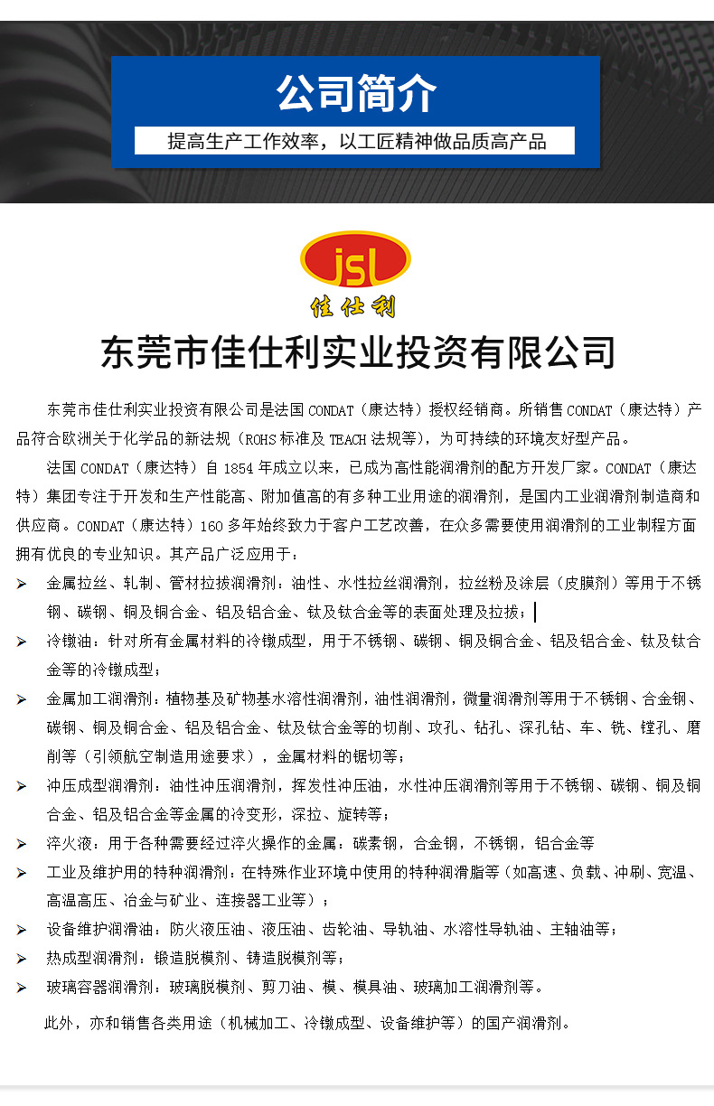 CONDAT(康达特)集团的使命,是在加工过程中,其产品致力于降低相互接触部件之间的摩擦系数。目的是开发、生产和销售能达到任何客户加工要求的工业润滑剂;提高工具、金属模具和设备的使用寿命;提高生产效率和提高客户产品的整体质量。