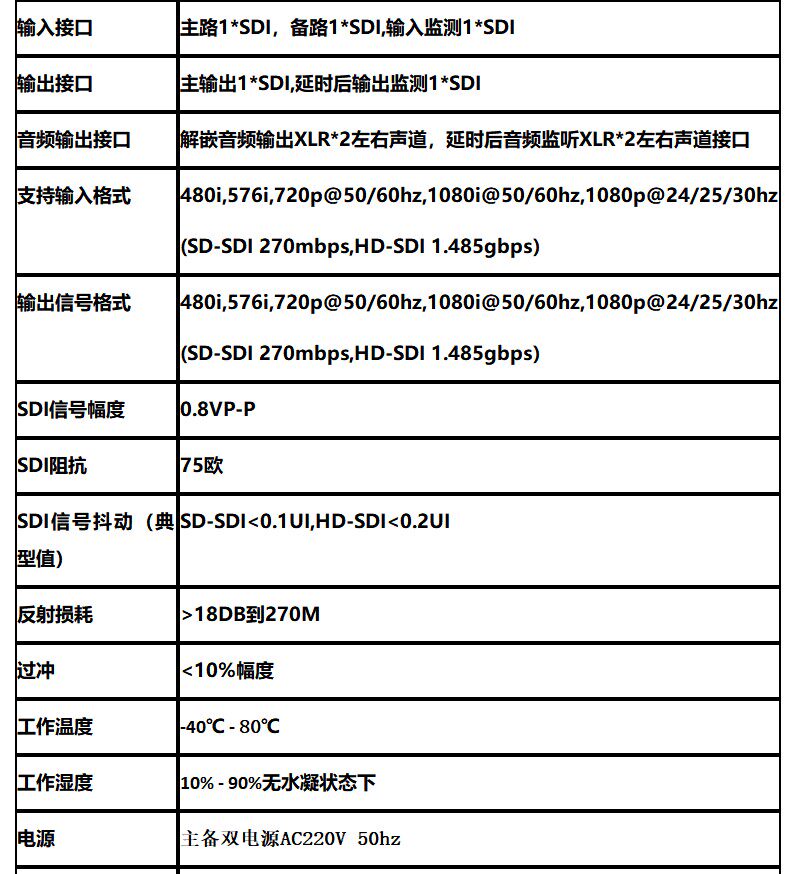 本设备自动识别标清高清SDI信号,可对信号提供0-30秒延时,使用户可对要播出的内容进行控制,删除不宜播出的内容,可广泛应用于各种实时播出场合。提供主备路SDI数字信号输入。主路作为延时调节使用,提供正常工作;备路为输出信号提供信号保障。提供延时前、后全面接口。具有信号监测和报警功能,可检测输入信号的SDI信号丢失、为操作人员提供提示。输出具有断电直通功能。