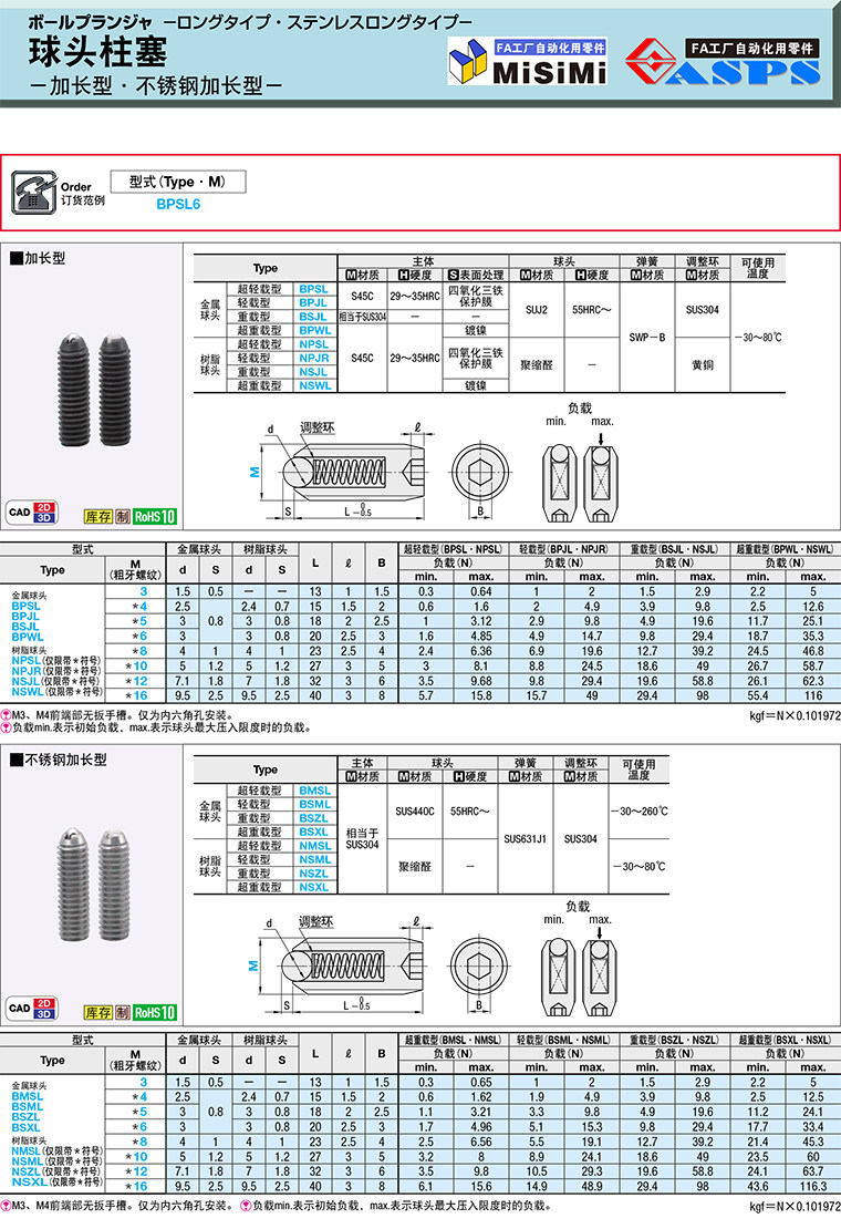 直销替换米思米怡合达球头柱塞BPSL/BPJL/BSJL/BPWL