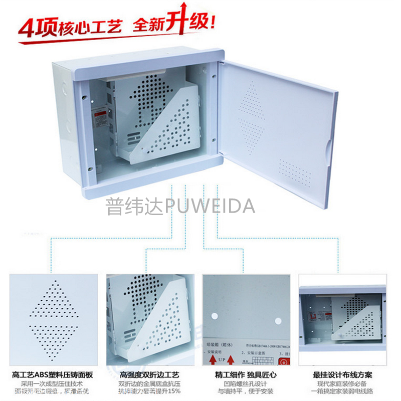 3.金属面板不必担心模块的散热问题,免去了塑料面板散热的危险性,运输安装也不易损坏;家居信息接入箱而采用高档豪华ABS朔料面板,有较解决箱内无线路由器信号不被屏蔽,FTTH光纤入户信息箱信号更稳定。这也是一个优点。