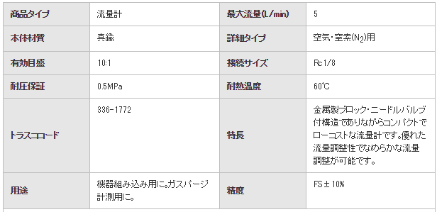 特長 金属製ブロック?ニードルバルブ付構造でありながらコンパクトでローコストな流量計です?優れた流量調整性でなめらかな流量調整が可能です?