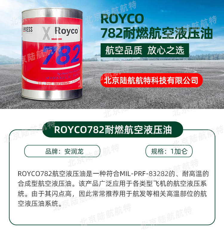 782耐燃航空液压油是一种高性能的航空液压油,符合MIL PRF 83282D标准。这种液压油由安润龙(ROYCO)公司生产,广泛应用于航空领域,特别是在需要耐燃性和高稳定性的环境中。