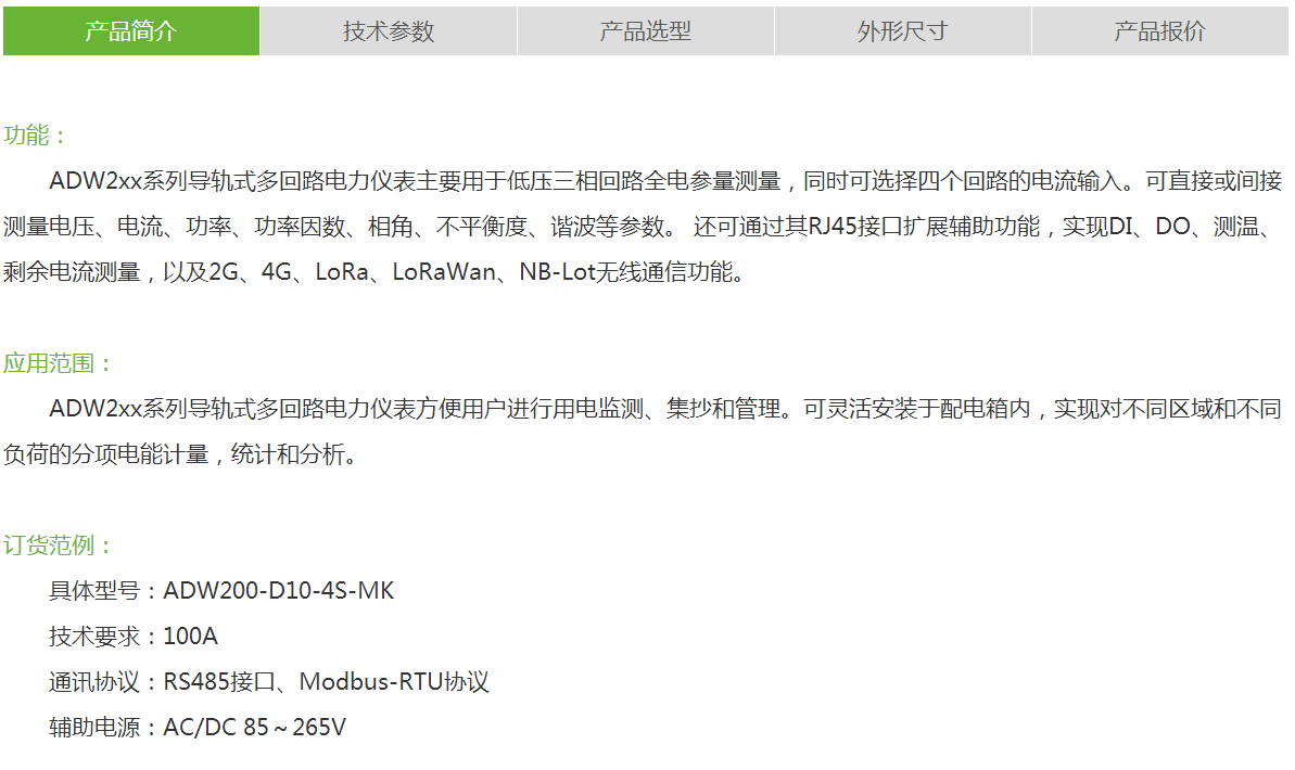 应用范围:ADW2xx系列导轨式多回路电力仪表方便用户进行用电监测、集抄和管理。可灵活安装于配电箱内,实现对不同区域和不同负荷的分项电能计量,统计和分析。