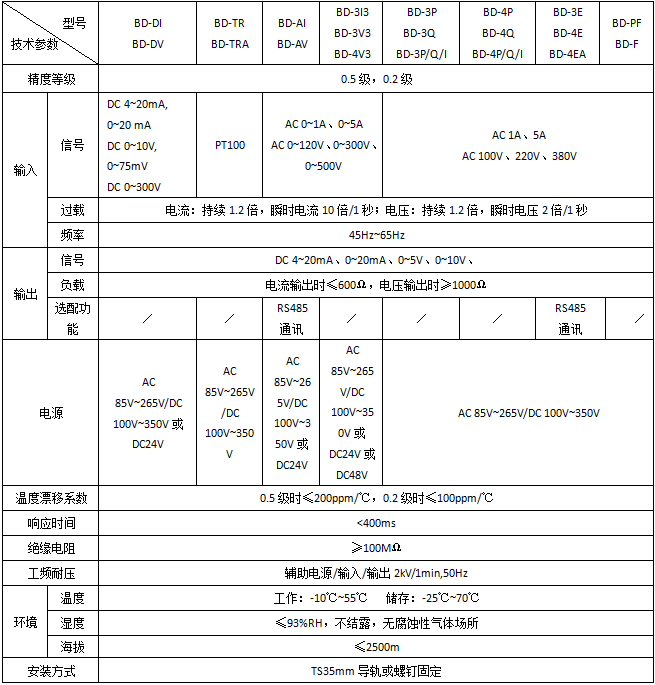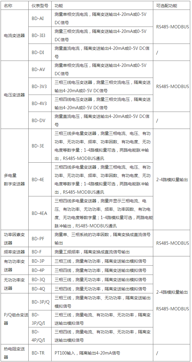 功能:BD系列电力变送器是一种将电网中的电流、电压、频率、功率、功率因数等电参量,经隔离变送成线性的直流模拟信号或数字信号的装置。
