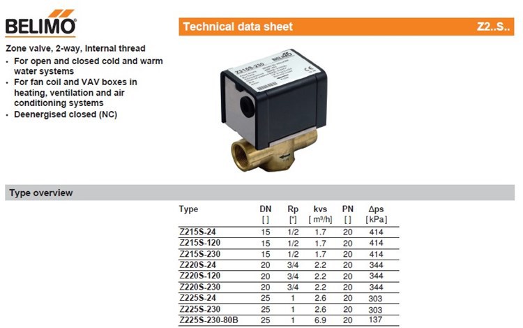 瑞士BELIMO Z220S-230电动二通阀适用于暖通空调系统中的风机盘管与变风量空调箱等末端设备,阀门可用于0℃(无凝固)到93℃冷热水。