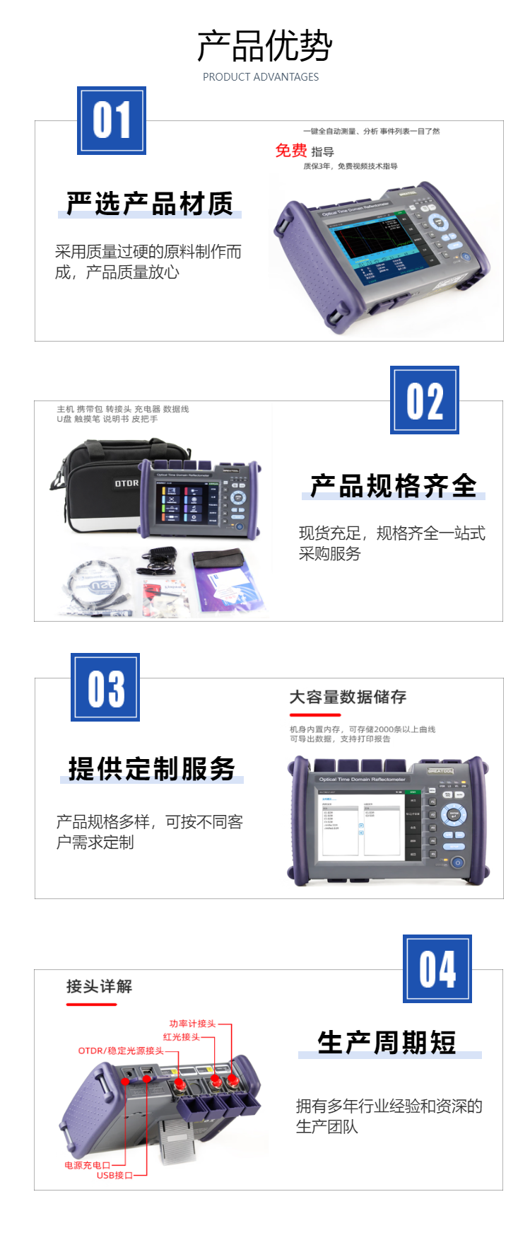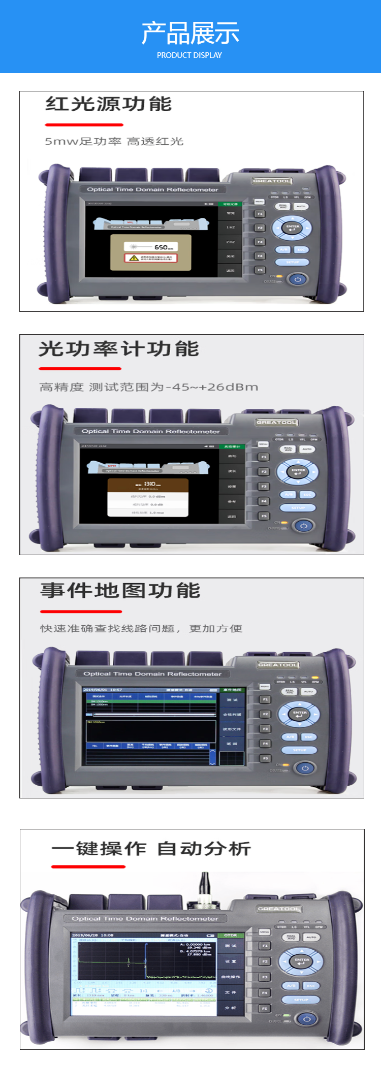 本仪器标配OTDR、光源、光功率计、可视故障定位(VFL)功能,还可选配事件地图(光眼)、端面检测、光缆普查仪、云平台、光损耗测试功能。