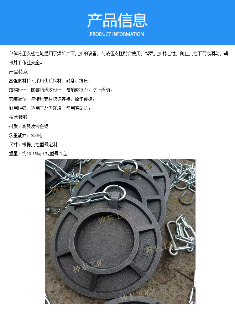 单体液压支柱柱鞋是用于煤矿井下支护的设备,与液压支柱配合使用,增强支护稳定性,防止支柱下沉或滑动,确保井下作业安全。
