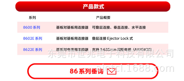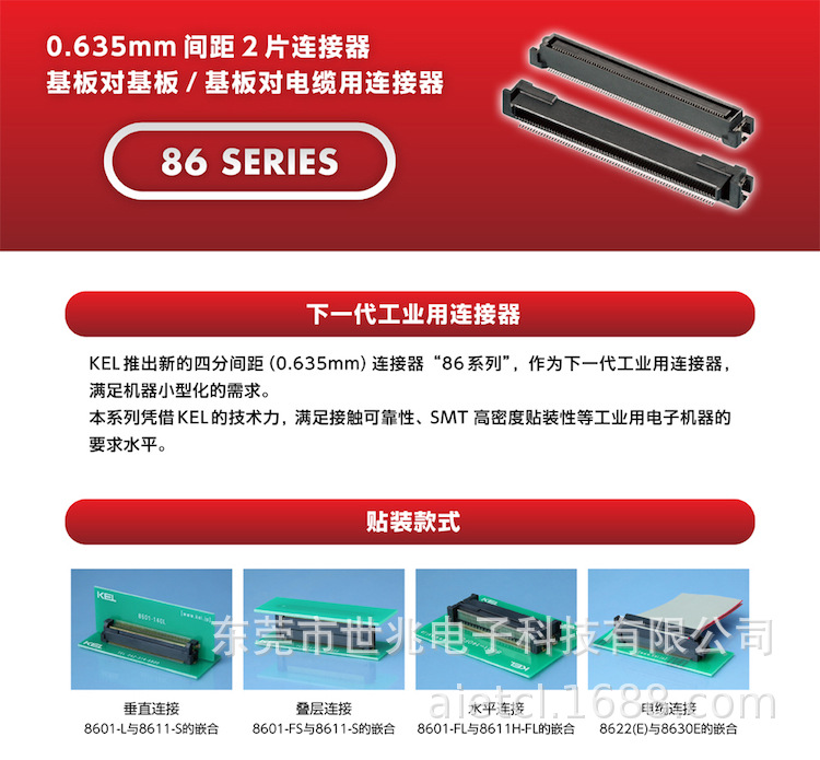 同族产品还有0.635mm间距的扁平电缆2片组合型8622E系列,可进行基板对基板用连接器的组合。
