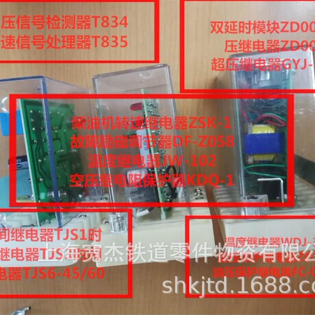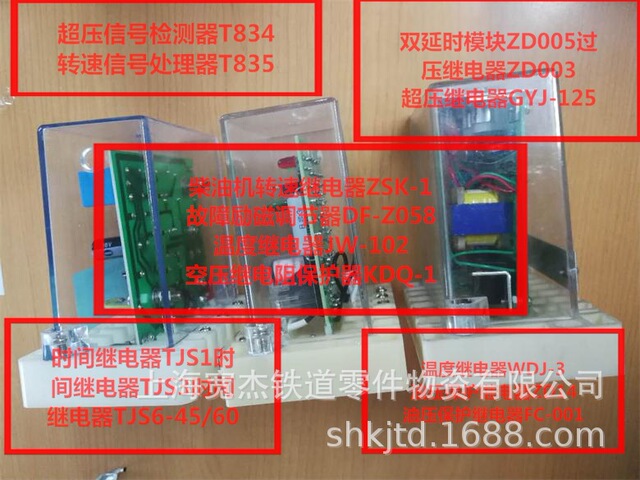 温度继电器WDJ-Ⅲ,油压保护继电器ZD014,双延时继电器ZD005,油压继电器TJY1A,油压继电器TJY1B,压力继电器TTJ2-196/11,压力继电器TTJ2-294/11,压力继电器TTJ2-392/11,压力继电器TTJ2-882/11,温度继电器SLD-3,温度继电器JW-102,单路温度继电器JW-102,时间继电器JS,时间继电器TJS1-20/22,时间继电器TXJT-702,柴油机转速继电器ZSK-2,风速继电器TJV1-07/10,过压继电器ZY607,节拍继电器,劈相机启动继电器TJQ2S,时间继电器TJS6-45/60,时间继电器TJS3,时间继电器N305.00.00,时间继电器QJSJ-45,时间继电器TXJT-702-00,通用继电器TJZ2-110/32,延时继电器TIME-AV-S,双延时模块ZD005,支路过流继电器TJL-1200,中间继电器QJZI,时间继电器TJS3,时间继电器TJS6-45/60,过压继电器TJDG2-125/10,过压继电器GYJ-125,过压继电器ZD003,过流继电器TJL3-0.5/11,空转继电器GJK2-0.5/11,固态继电器GTJ9-10A,固态继电器GH-2Z2210,固态继电器TT-L5A,固态继电器G3TB-0D201P,励磁调节器GLTQ,励磁调节器GLTQ-2,空压机电阻保护器KDQ-1,抑制器YZQ-3,抑制器1Q18.900.000,整流匣ZD-011, 过流整流3ZL(N411.08.00),接地整流板4ZL(N411.24.00),电流信号整流板3ZL(T65.19.00),整流板4ZL(T735.04.00)逆流组件T735.8.00固态继电器JGX-16FA,机车车底插销NXD,机车换向联锁器TKL1,接地继电器TJJ2-18/21,压力继电器TJY-4.8/11,风道继电器TJY5A-0.3,TJY电子式过渡继电器,TJC电子式过渡继电器,过流整流板3ZL,整流板4ZL,抑制器YZQ-3,同步变压器TKB1A,机车方向保护器BHQ-2,风道继电器TJY5A-0.3,DF8B机车阻容电阻,转速信号处理器T835,超压信号处理器T834,