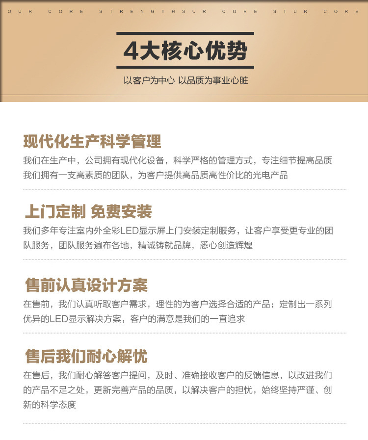 除LED灯珠光源外,LED显示屏还采用了许多其它辅助部件,如电路板、塑料外壳、开关电源、插座、外壳等,如果其中任何一个部件出现质量问题,就有可能导致屏幕寿命下降。因此,显示屏的寿命是由其关键部件的寿命所决定的。例如LED、开关电源、金属外壳等都是8年标准选用,而电路板的保护工艺性能仅能支撑其工作3年,3年后由于锈蚀可能出现损坏,那么我们也只能得到一个7年寿命的显示屏。