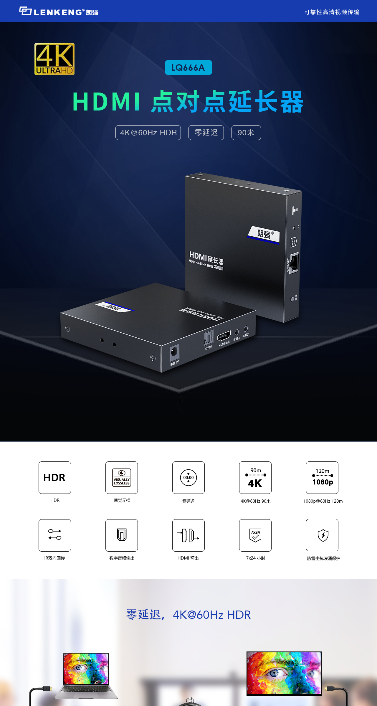 hdmi双绞线延长器厂家4K60hz能传输90米点对点带rs232有环路LQ666A